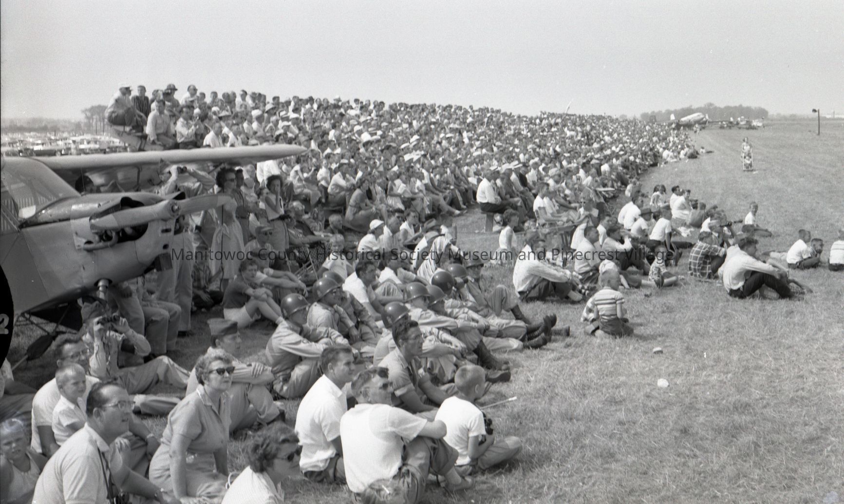 Lion's Club Air Show crowd at the Manitowoc County Airport. The C-47 cargo plane (also known as a DC-3) in background. Photograph taken in June 1957.Made/Created
