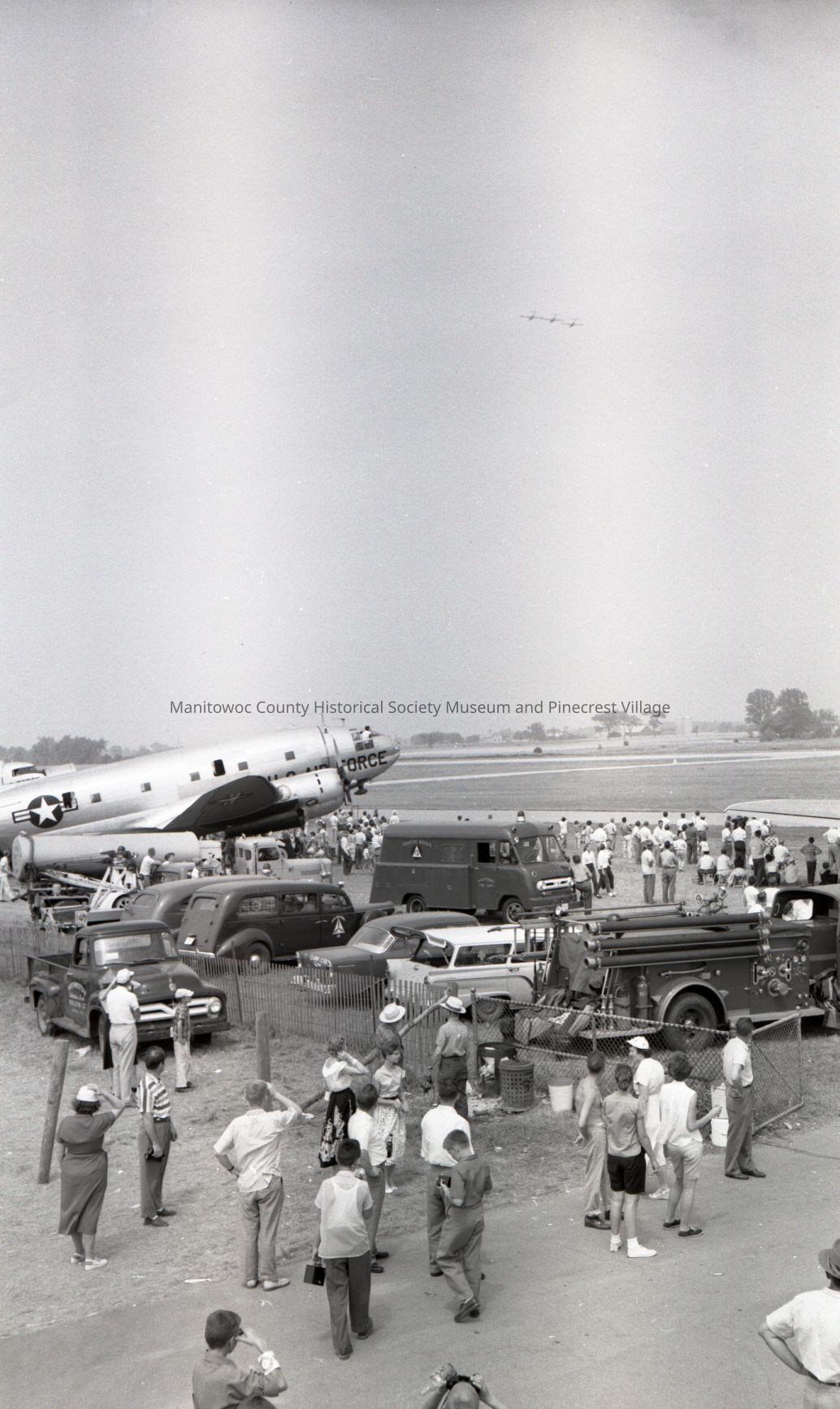 Lion's Club Air Show at the Manitowoc County Airport. The C-46 Dakota cargo plane in background. Photograph taken in June 1957.Made/Created