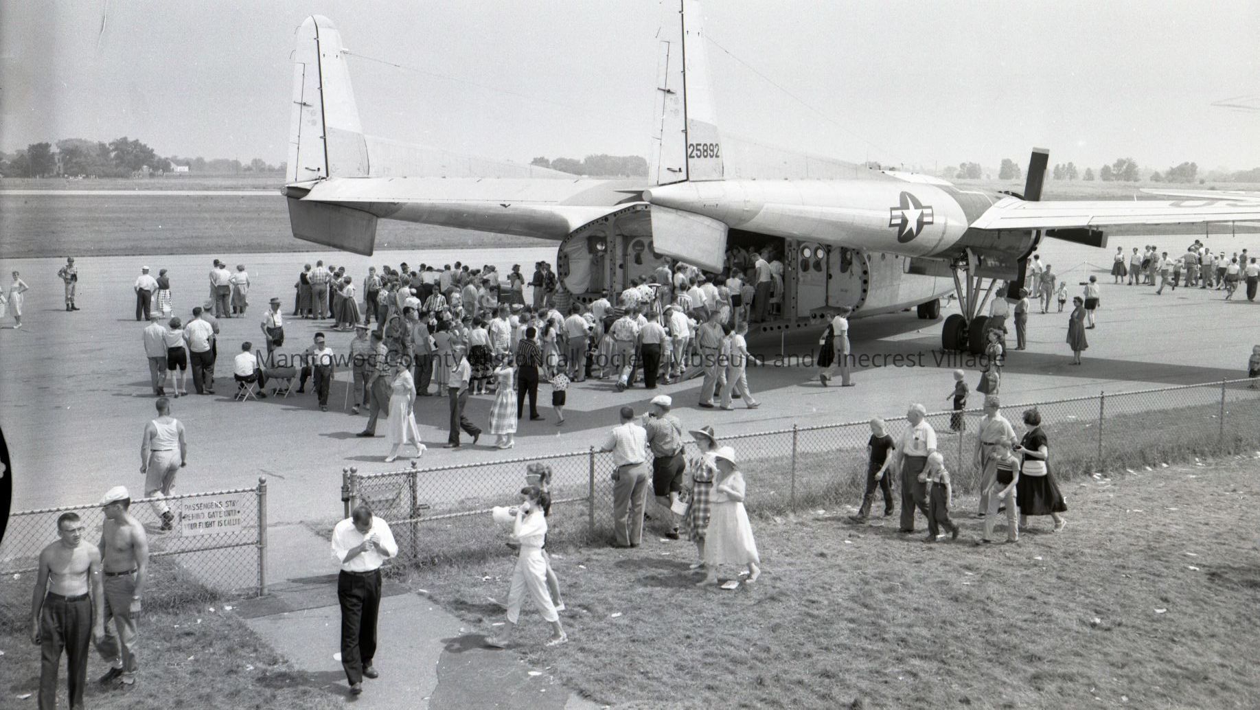 Crowd looking at the C-119 Flying Boxcar during the Lion's Club Air Show at the Manitowoc County Airport. Photograph taken in June 1957.Made/Created