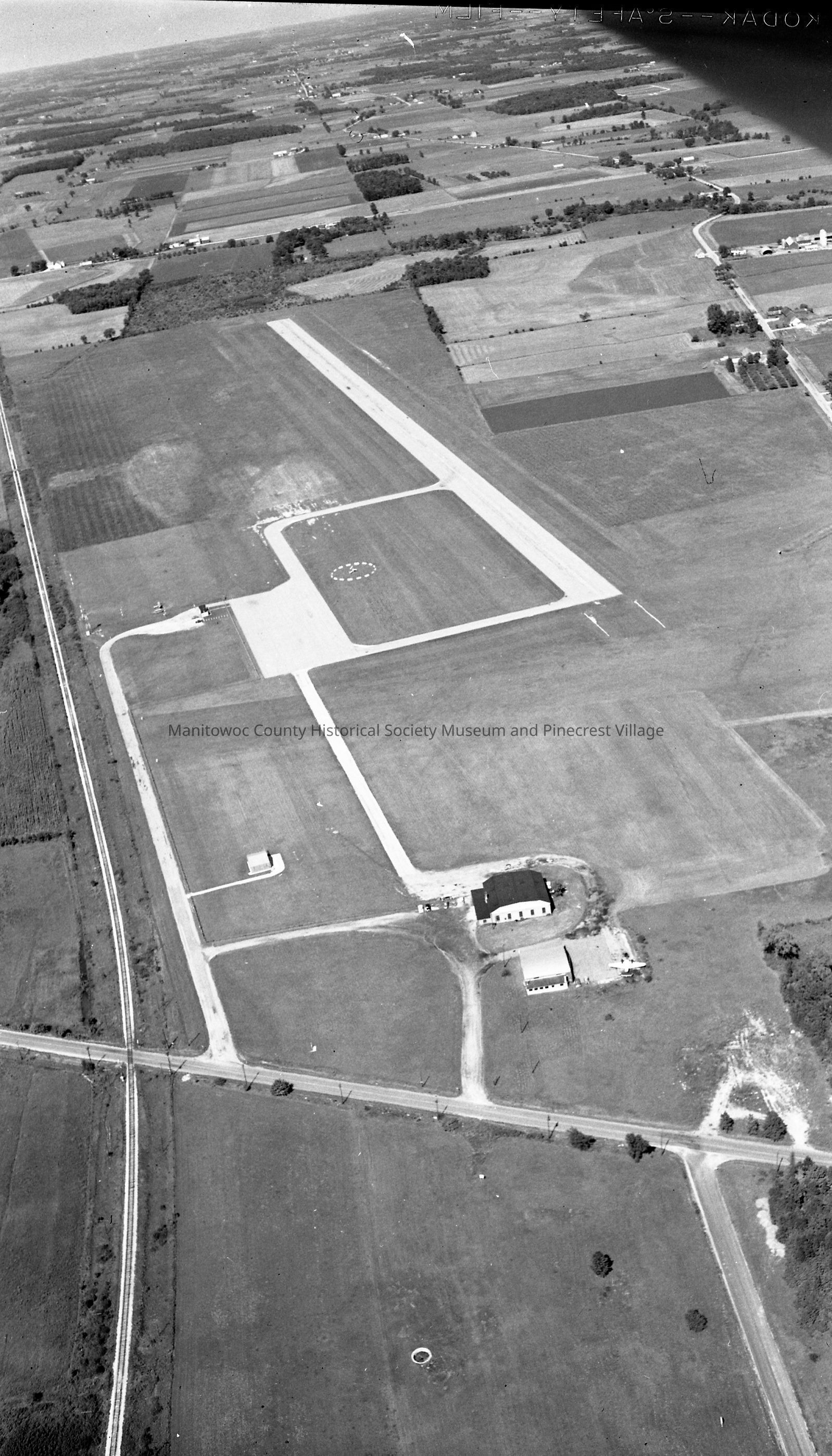 Aerial of the Manitowoc County Airport on Menasha Ave Manitowoc. Kakuk air service hanger is near bottom above Menasha Ave. Street at upper right is Nagle Ave. and rail line at left is C&NW mainline to Green Bay. Photograph taken on September 4th, 1958.Made/Created