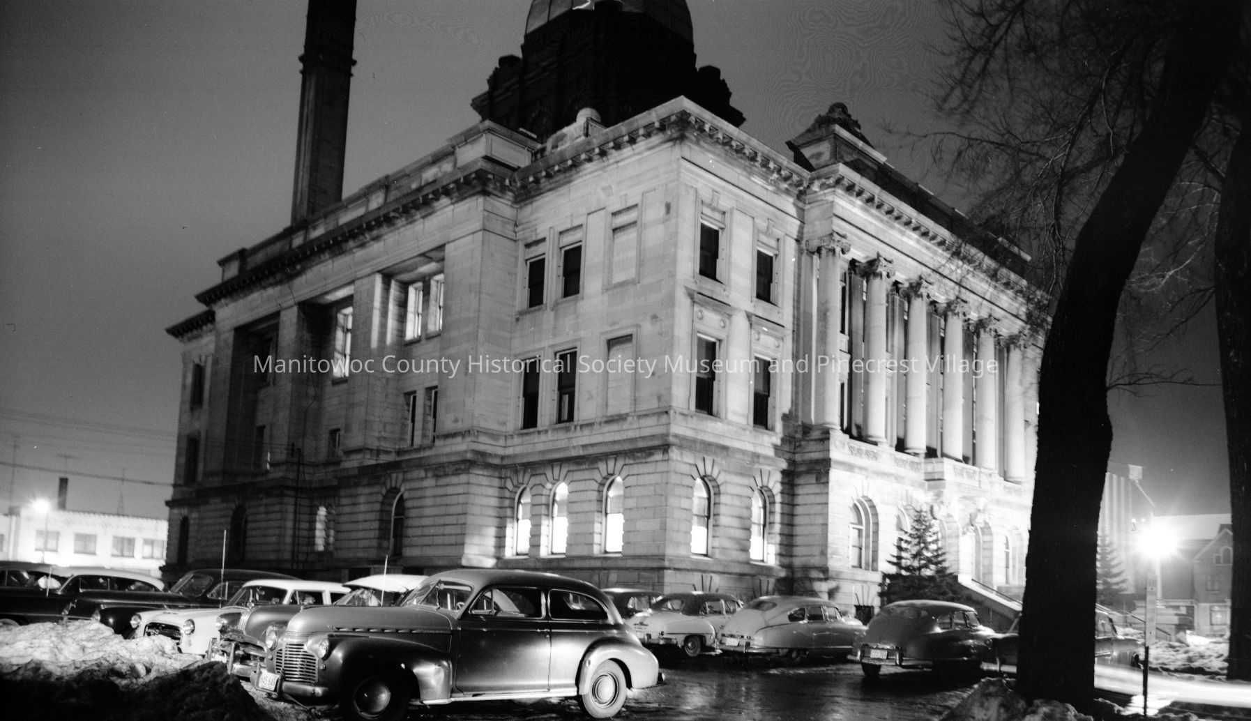 Manitowoc County Courthouse; looking at southeast side. Photograph taken in March 1955.