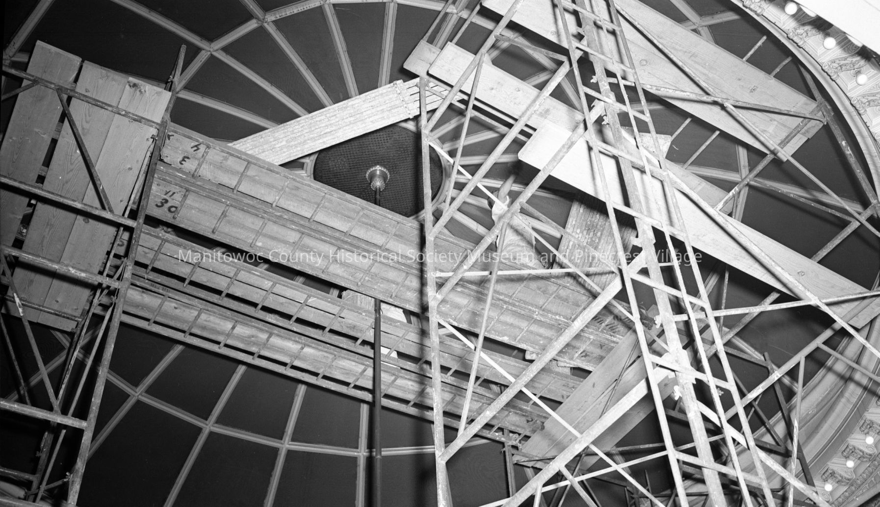 Manitowoc County Courthouse; working on dome interior. Photograph taken on December 15th, 1952.