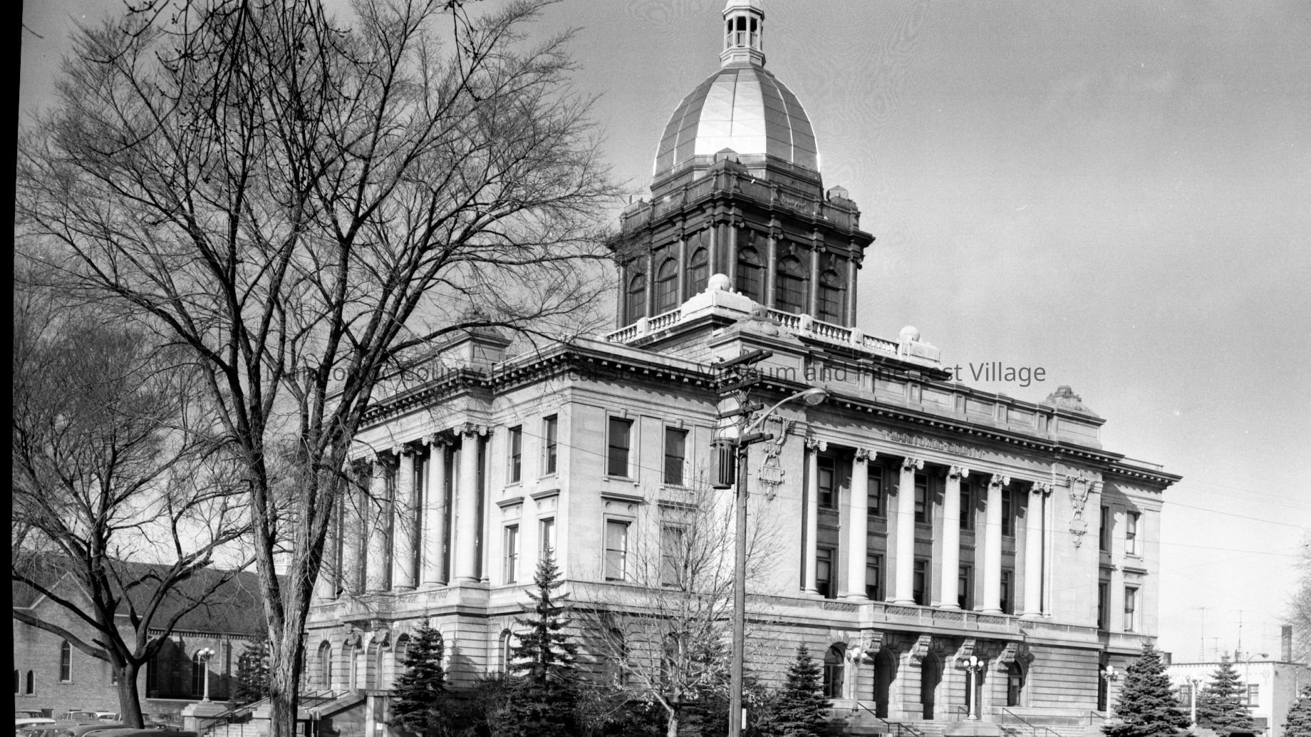 Manitowoc County Courthouse; looking from South 8th & Hancock Street. At left is First Reformed church on Hancock Street. Photograph taken in November 1961.Made/Created