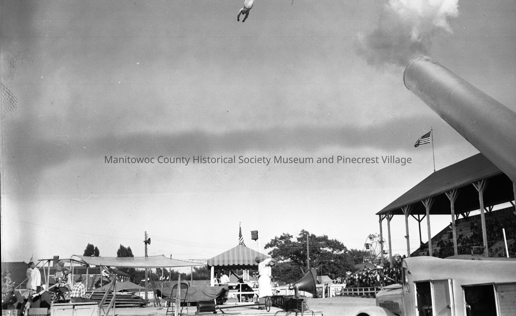 Manitowoc County Fair; man shot out of cannon. Photograph taken in August 1953.