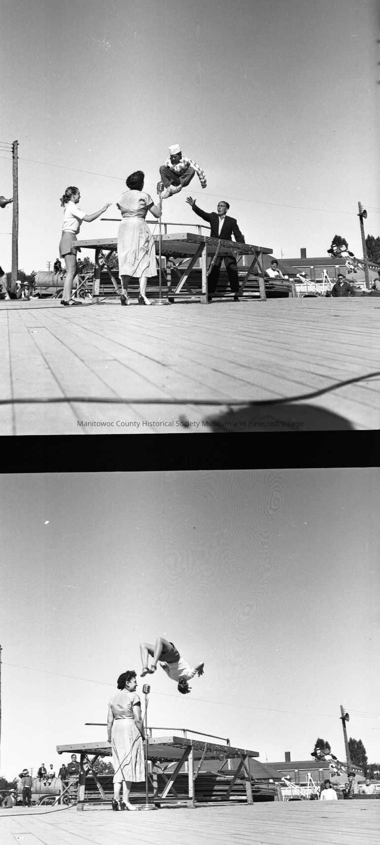 Manitowoc County Fair; trampoline act on stage. Photograph taken in August 1953.