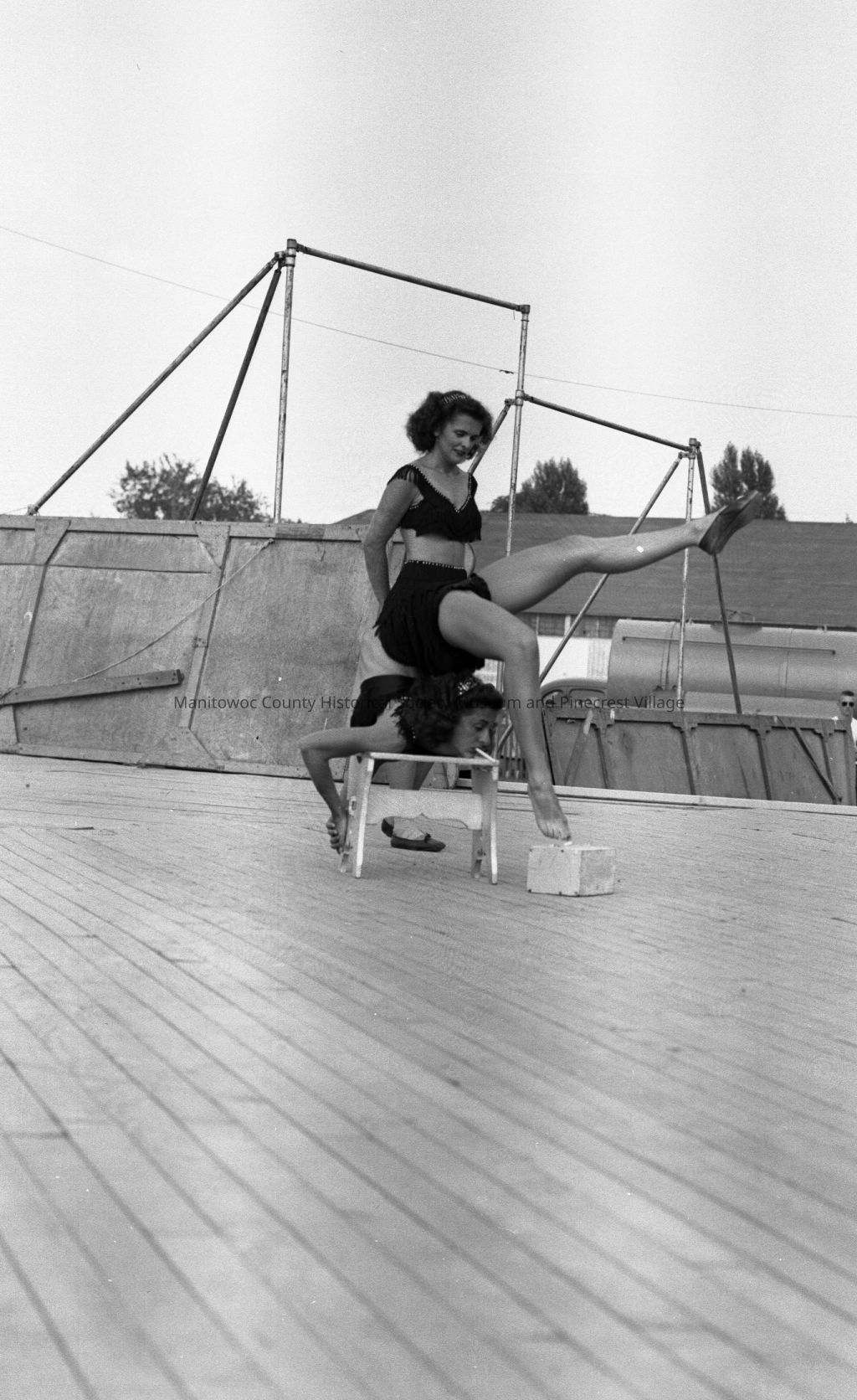 Manitowoc County Fair; acrobats on stage. Photograph taken in August 1953.