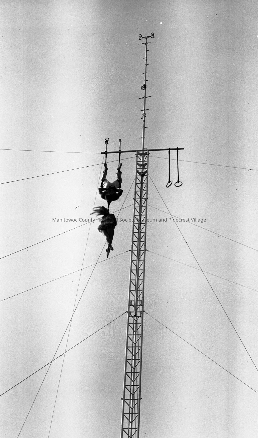 Manitowoc County Fair; high wire act. Photograph taken in August 1953.