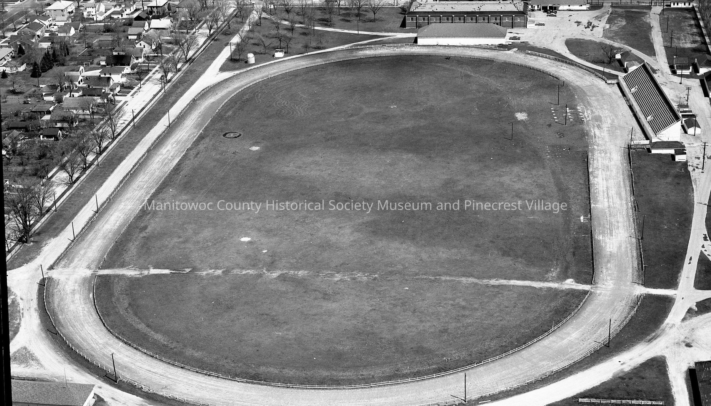 Aerial: Manitowoc County Fairground, North 18th Street & New York Ave Manitowoc. At top is armory on North 18th; right are grandstands and bottom are cattle barns.