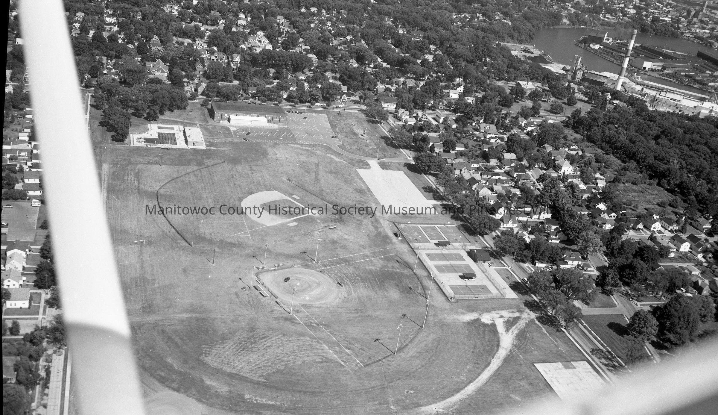Aerial- view of old Manitowoc County Fairgrounds, North 18th Street and New York Ave. New ball diamond and tennis courts. At top of open area is the Armory on North 18th Street next to municipal pool. Photograph taken on July 21st, 1975.Made/Created