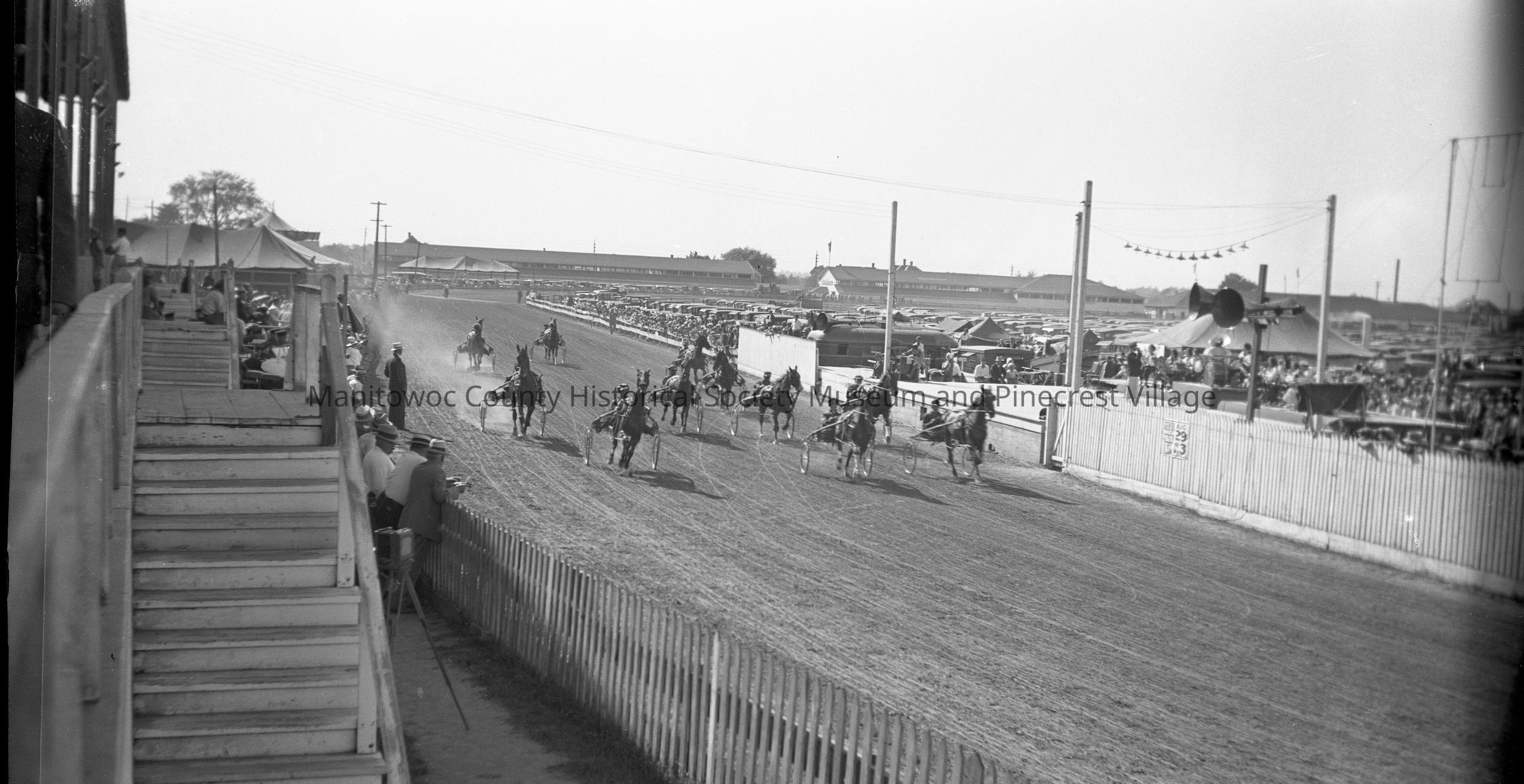 Manitowoc County Fairgrounds looking west, sulky racing. Circa 1925.
