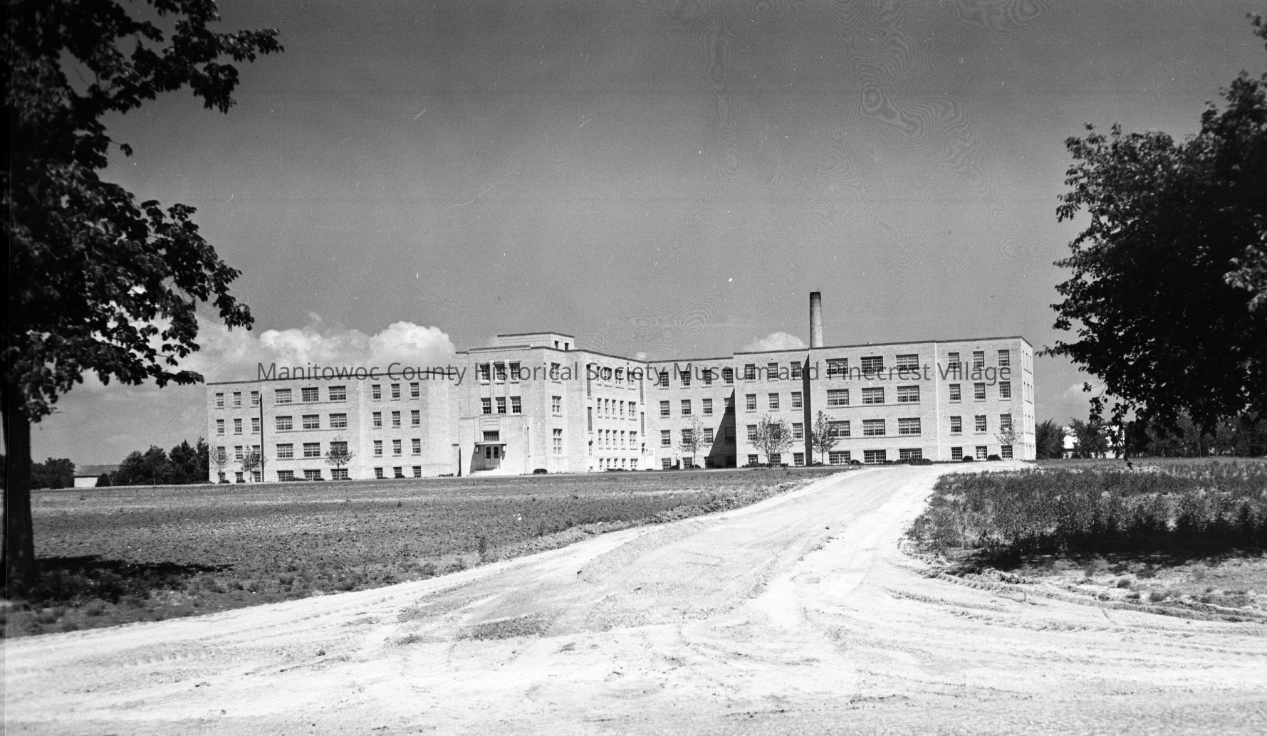 Manitowoc County Hospital; new at 4200 Calumet Ave Manitowoc; looking up old driveway at front of building. Photograph taken in 1950.Made/Created