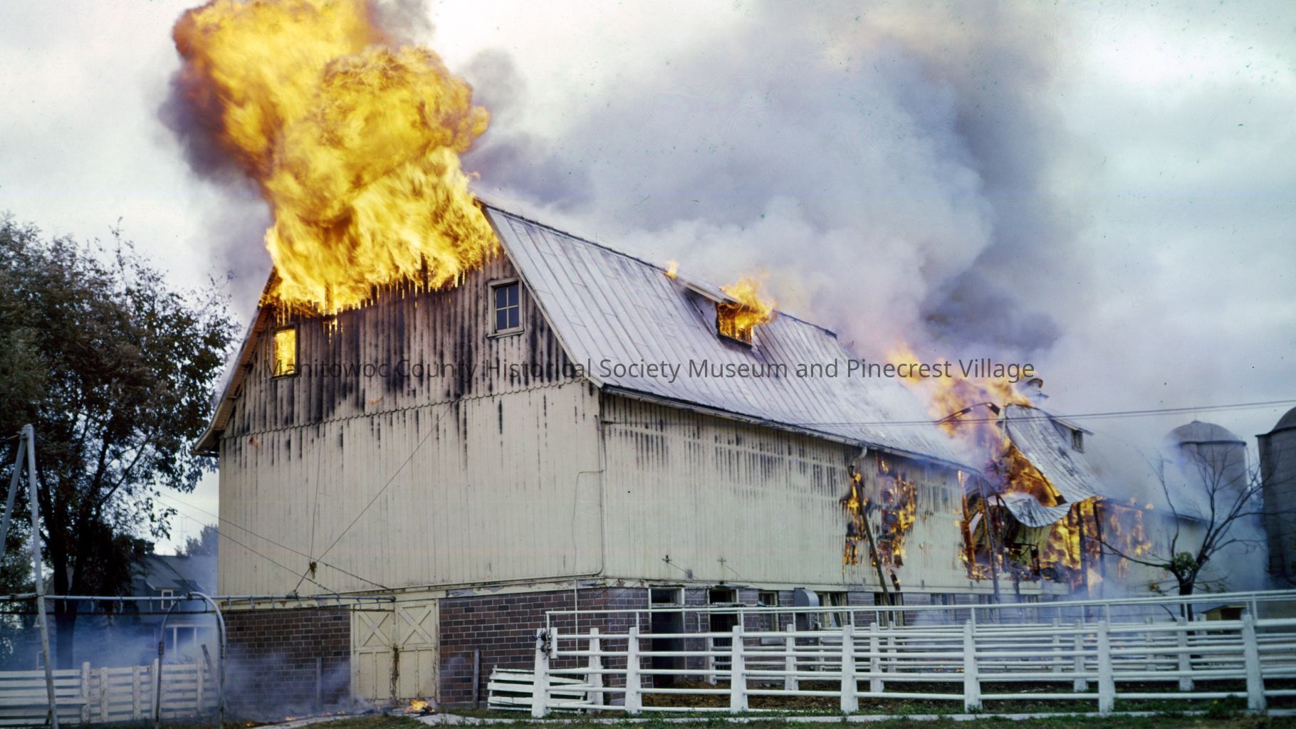 Manitowoc County Hospital; new at 4200 Calumet Ave Manitowoc; barn fire. Photograph taken on October 13th, 1961.Made/Created