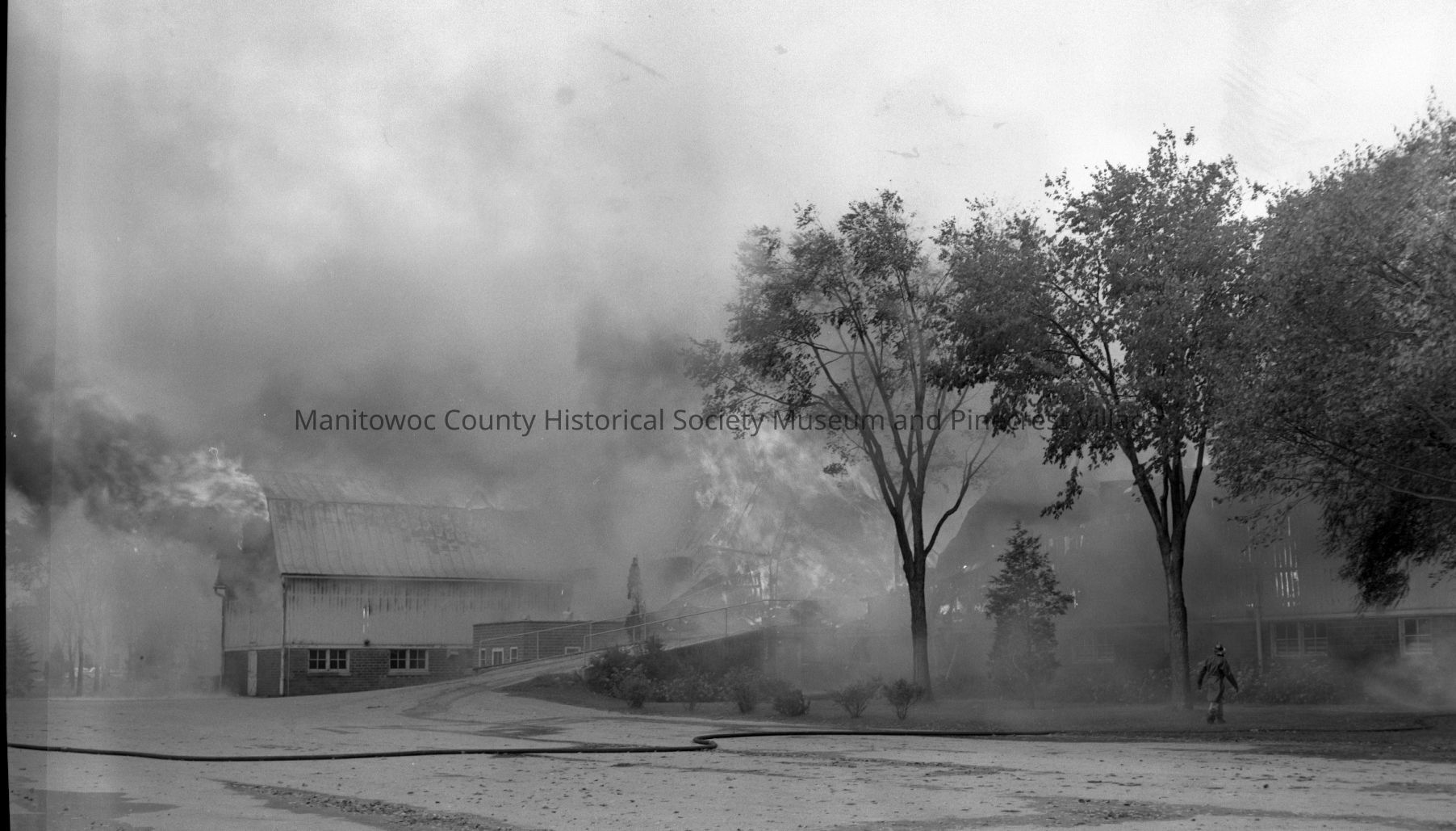 Manitowoc County Hospital; new at 4200 Calumet Ave Manitowoc; barn fire. Photograph taken on October 13th, 1961.Made/Created