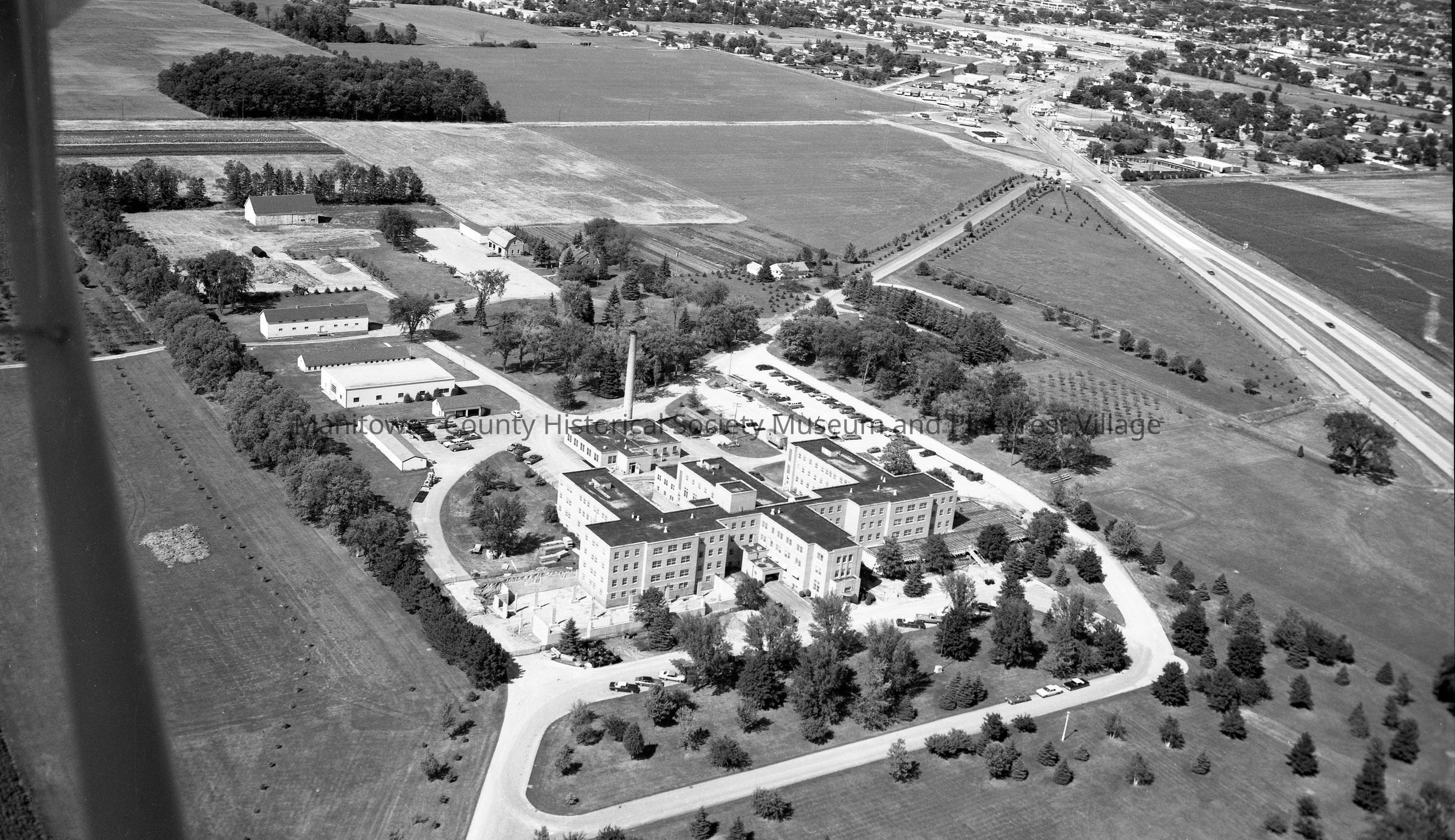 Aerial view of the Manitowoc County Hospital and out buildings at right is Calumet Ave. Photograph taken on July 21st, 1975.Made/Created