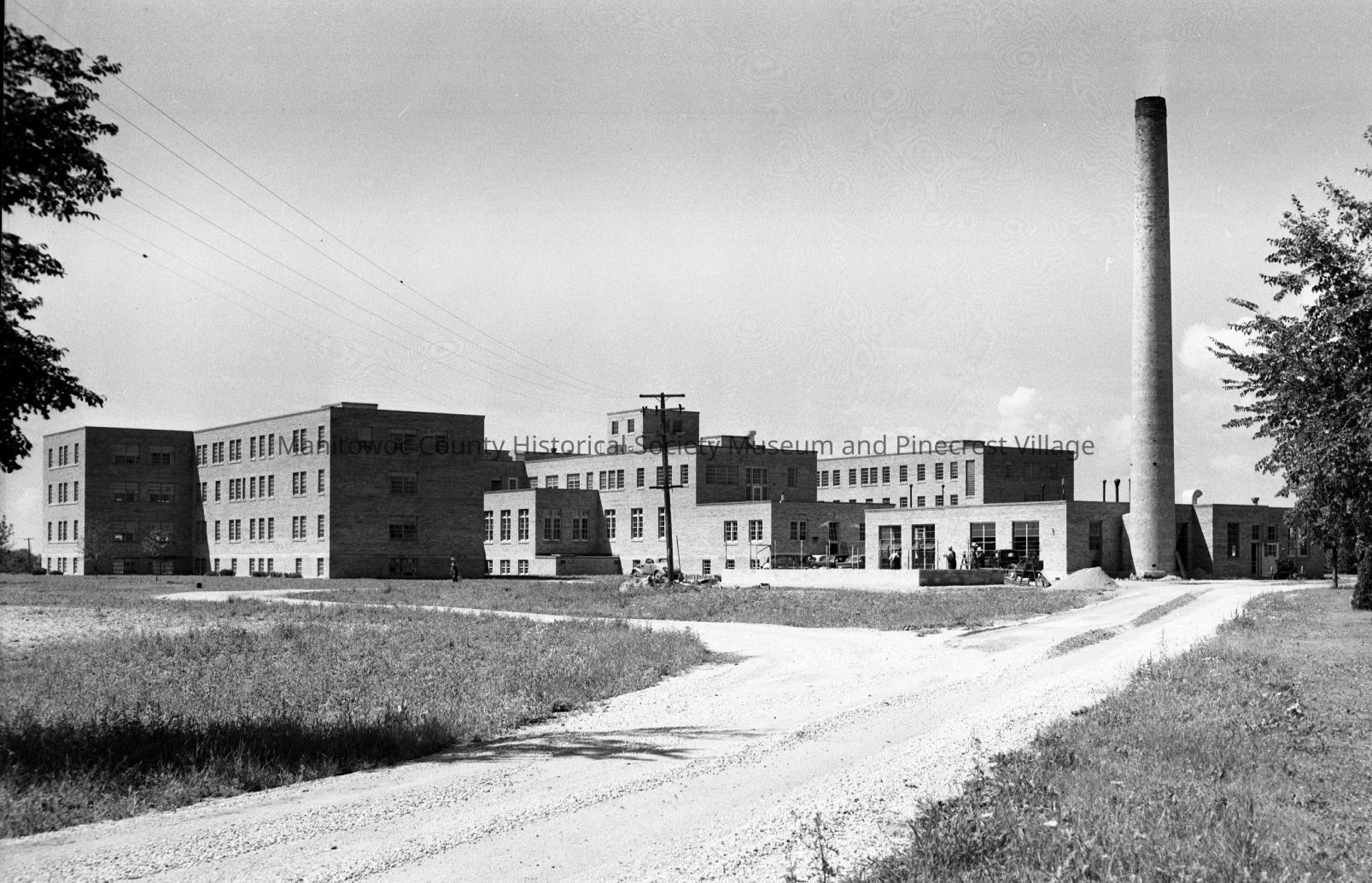 Manitowoc County Hospital; new at 4200 Calumet Ave Manitowoc; looking at east end and power plant. Photograph taken in 1950.Made/Created