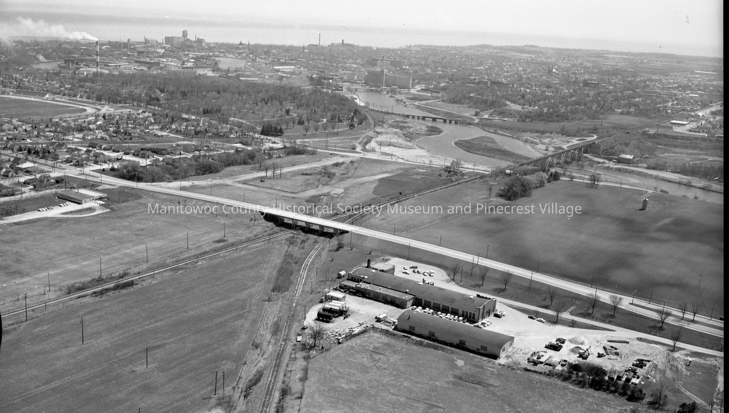 Aerial view of Manitowoc County Shops, Waldo Blvd. and the Waldo Blvd. overpass. Photograph taken in August 1963.Made/Created
