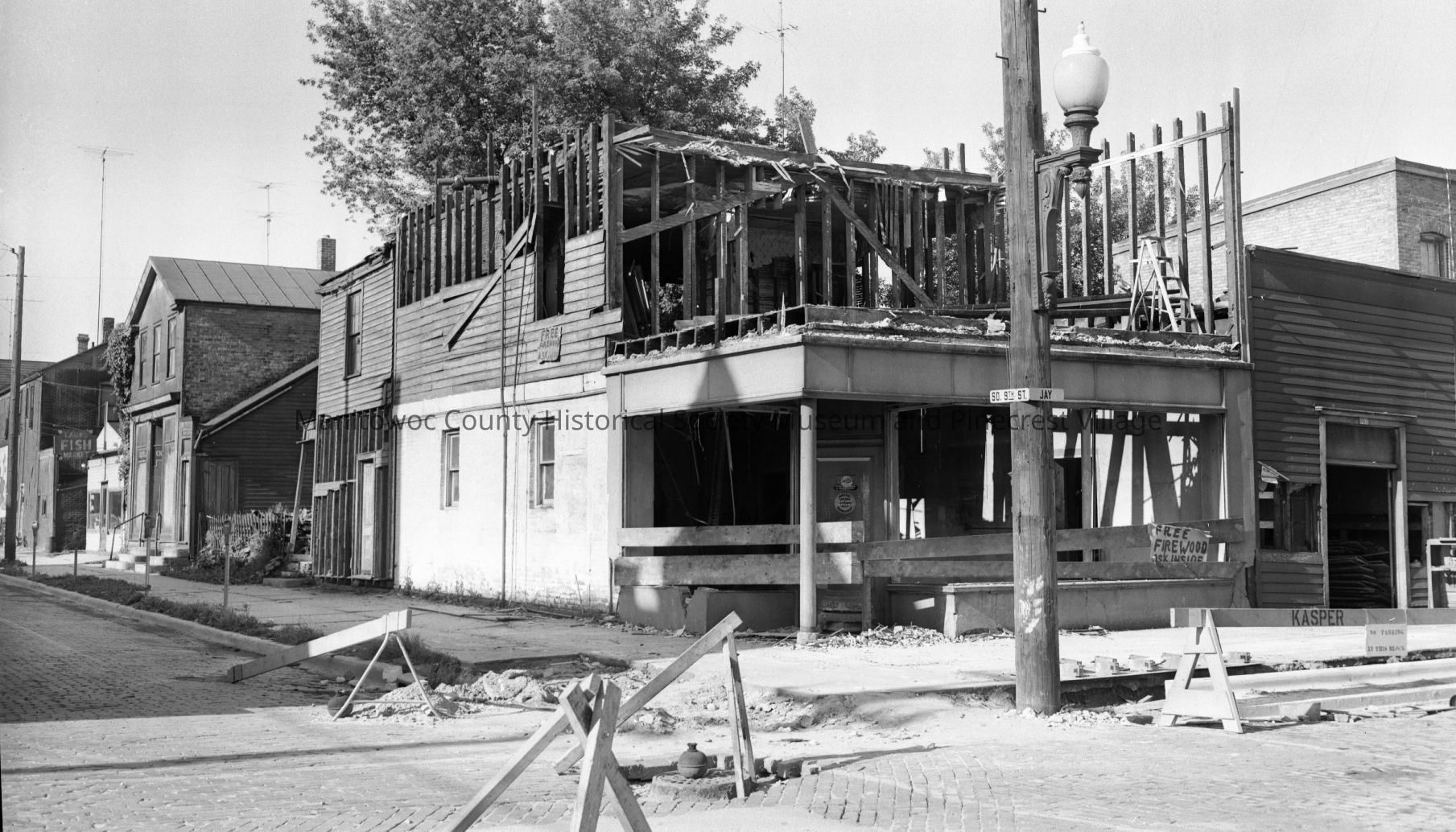 Manitowoc Electric Motors building, 901 Jay Street Manitowoc, being torn down. At left is Muchin Furniture storage, 928 and Lades Fish Market, 930 South 9th Street. Photograph taken on July 17th, 1956.Made/Created