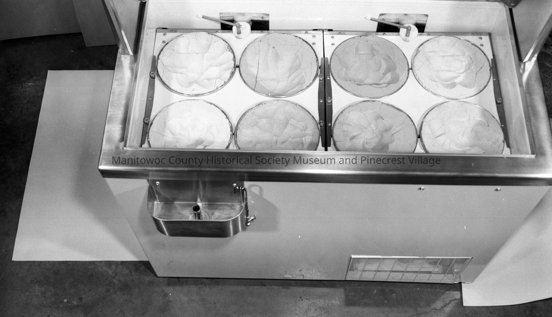 Manitowoc Equipment Works, 621 Quay Street Manitowoc; small commercial ice cream freezer. Looking down at ice cream pails and ice cream scoop holder at left. Photograph taken on July 24th, 1967.Made/Created