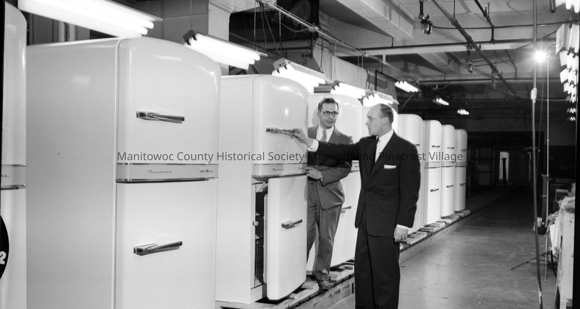 Manitowoc Equipment Works, 621 Quay Street Manitowoc; new 2-zone freezer on the finish line. Photograph taken on December 12th, 1956.Made/Created