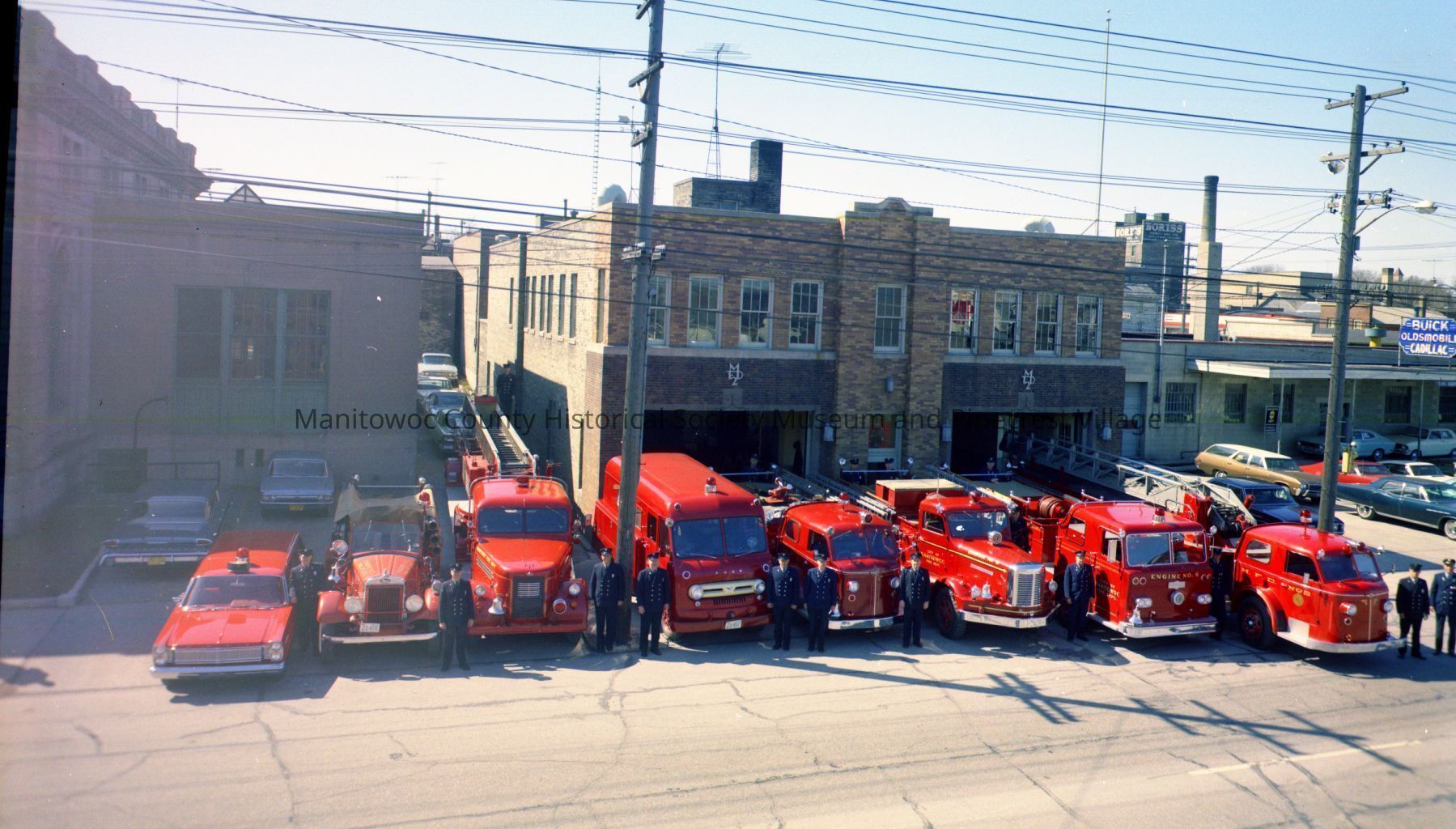 Manitowoc Fire Department; Chief's car, back-up engine pumper, back-up aerial with rear tiller, rescue squad, engine #4 from Northside Station, engine #5 from Franklin Station, engine #6 from Westside Station and main aerial from Franklin Station. Photograph taken in 1968.Made/Created