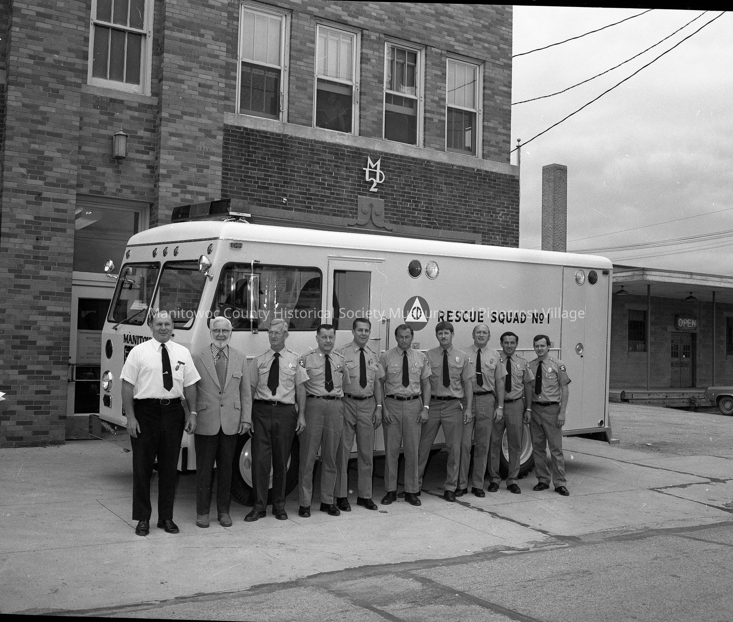 New rescue squad at Manitowoc Franklin Street Station. Left to Right: Chief Herzog, ?, George Rosinsky, George Orth, Herbert Orth, Jerry Thuss, Charles Weiss, Calvin Wester, Jerry Keehan and Bob Burtard. Circa 1976.Made/Created