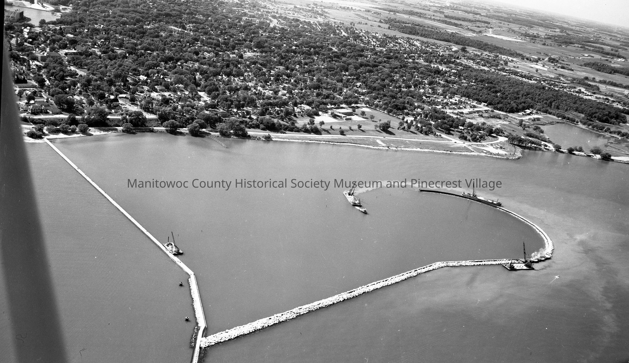 Aerial view of the new Manitowoc Marina containment area being built. Photograph taken on July 21st, 1975.