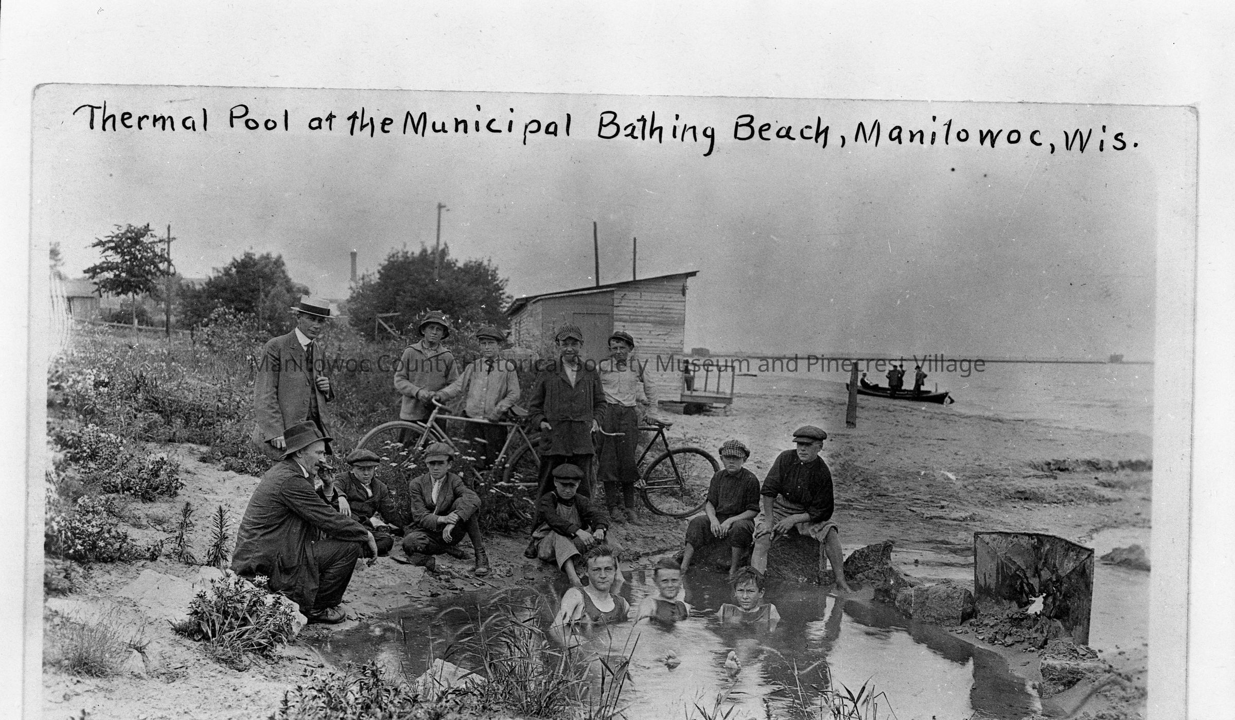 Manitowoc Municipal beach at end of Columbus Street. Warm water discharge from Manitowoc Public Utilities Plant. Circa 1915.Made/Created