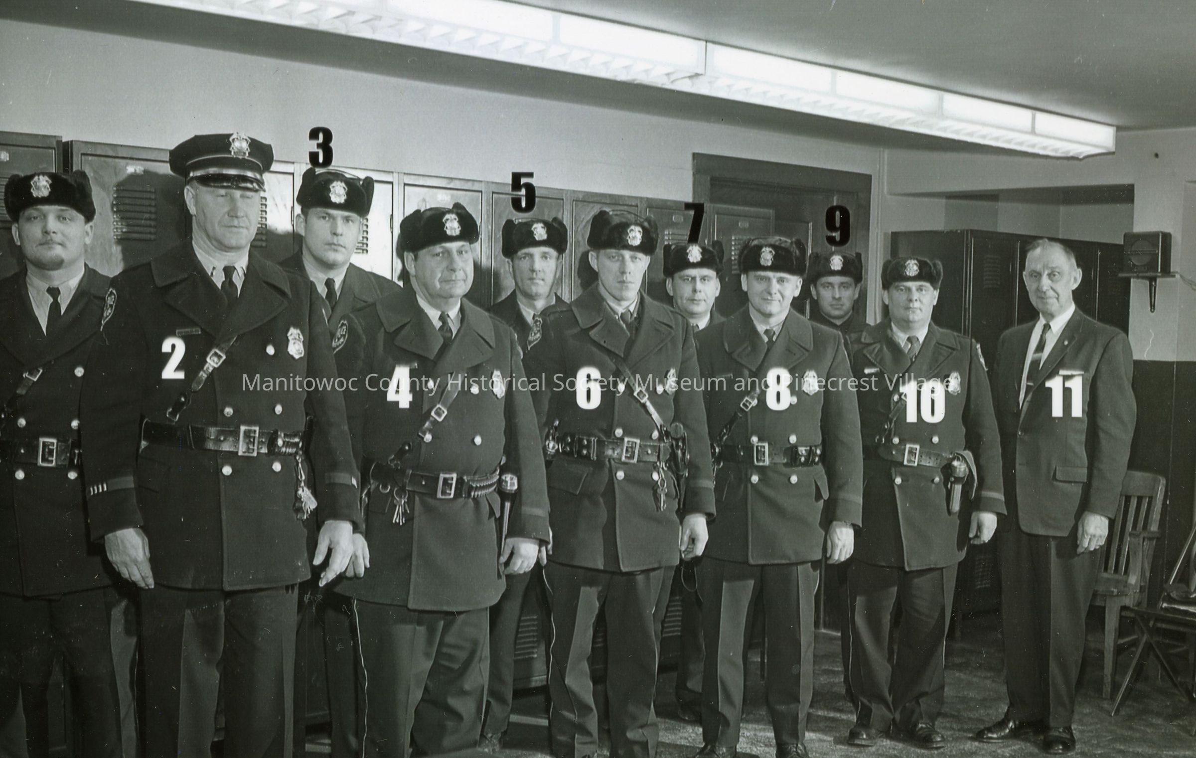 B/W Manitowoc Polie Dept afternoon shift 1. Phil Andrastek, 2. Jake Mraz, 3. Jim Prouls, 4. Wm. Tech, 5. Leo Hein, 6. Marvin Bauch, 7. Paul Frozena, 8. Art Fuller, 9. Ronald Rusboldt, 10. Rollie Dueno, 11. Chief Frank TomchekMade/Created