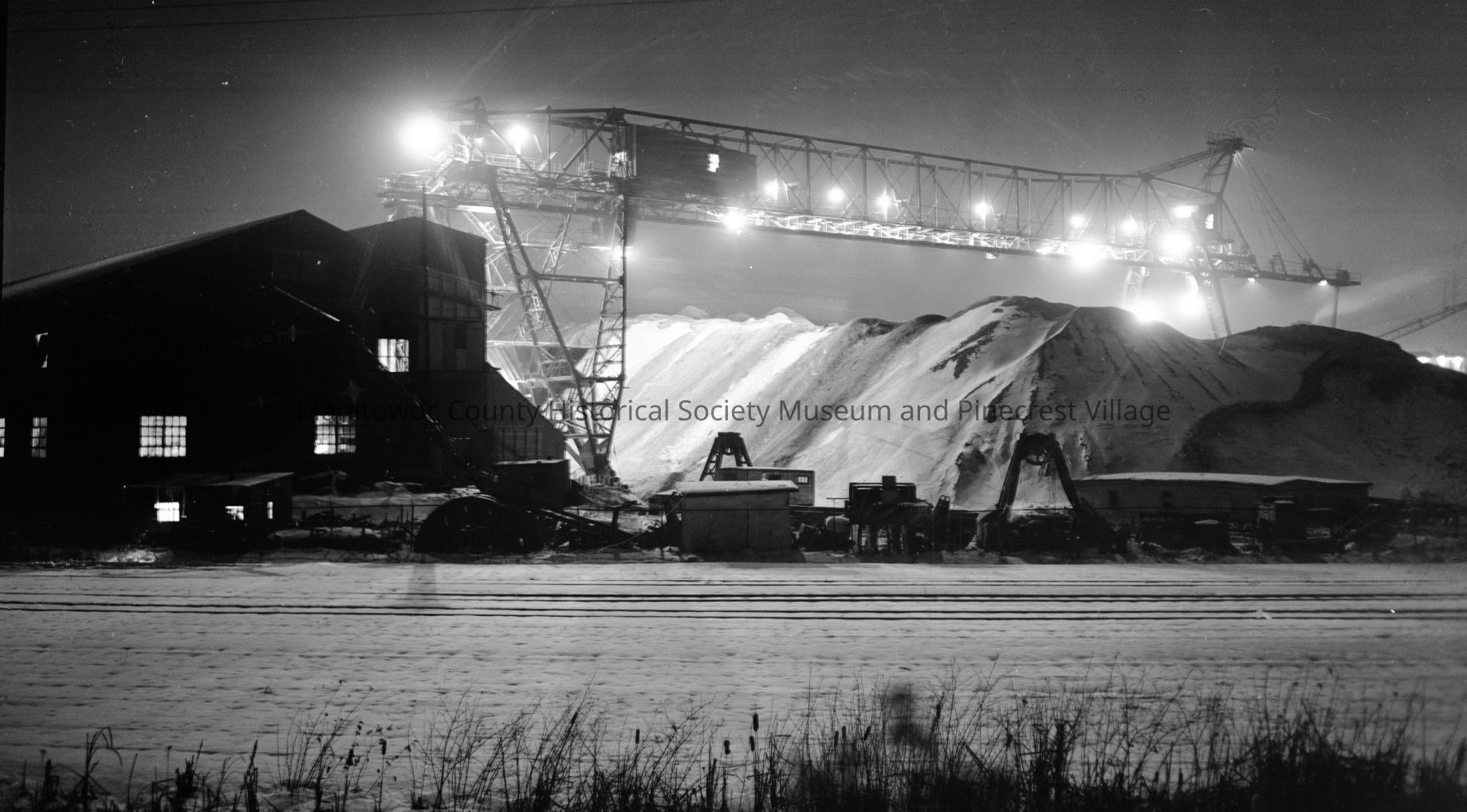 Gantry crane at Manitowoc Portland Cement Company, 1801 Spring Street Manitowoc. Night photo. Photograph taken on November 9th, 1951.Made/Created