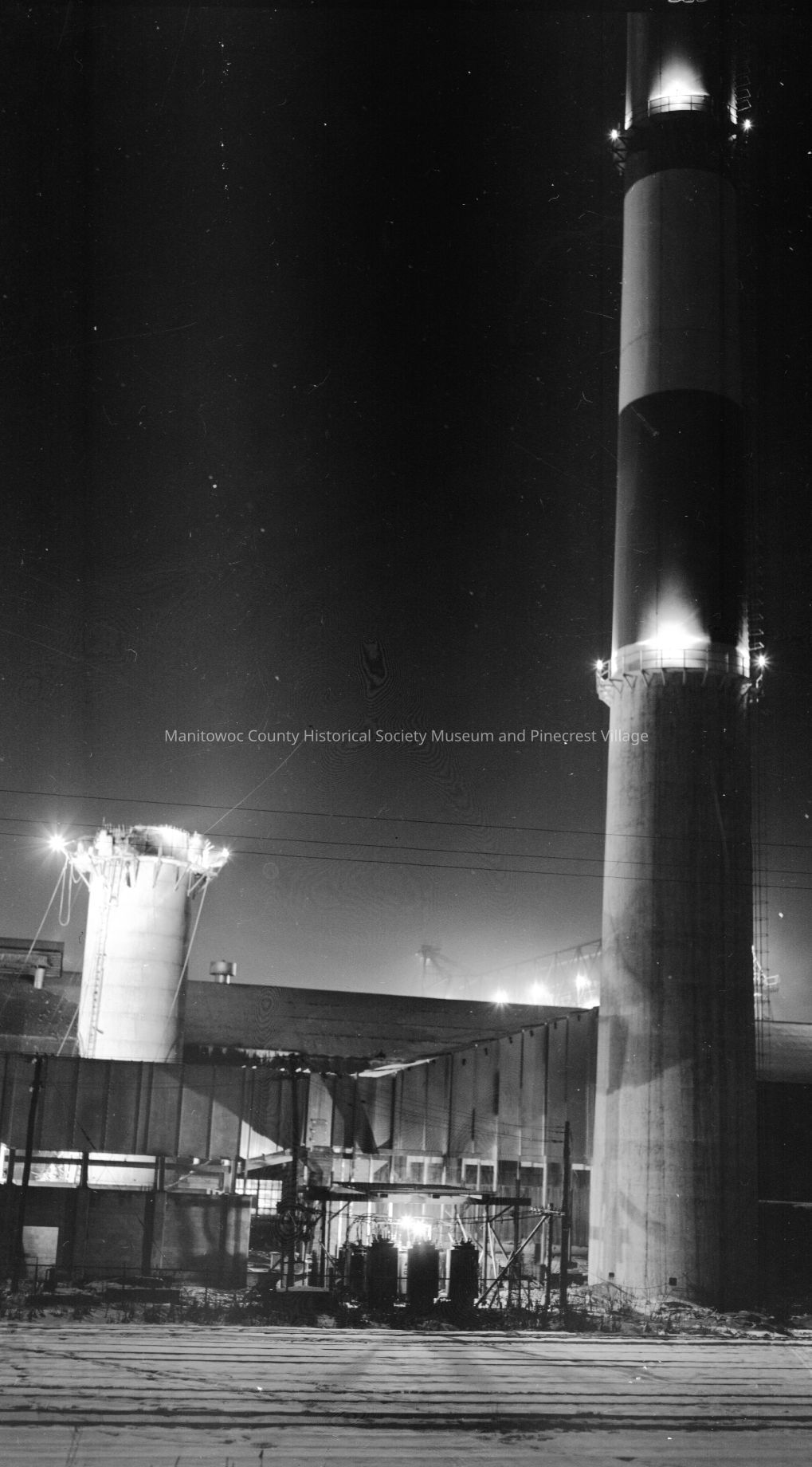 Old smokestack coming down at Manitowoc Portland Cement, 1801 Spring Street Manitowoc. Night photo. Photograph taken on November 9th, 1951.Made/Created