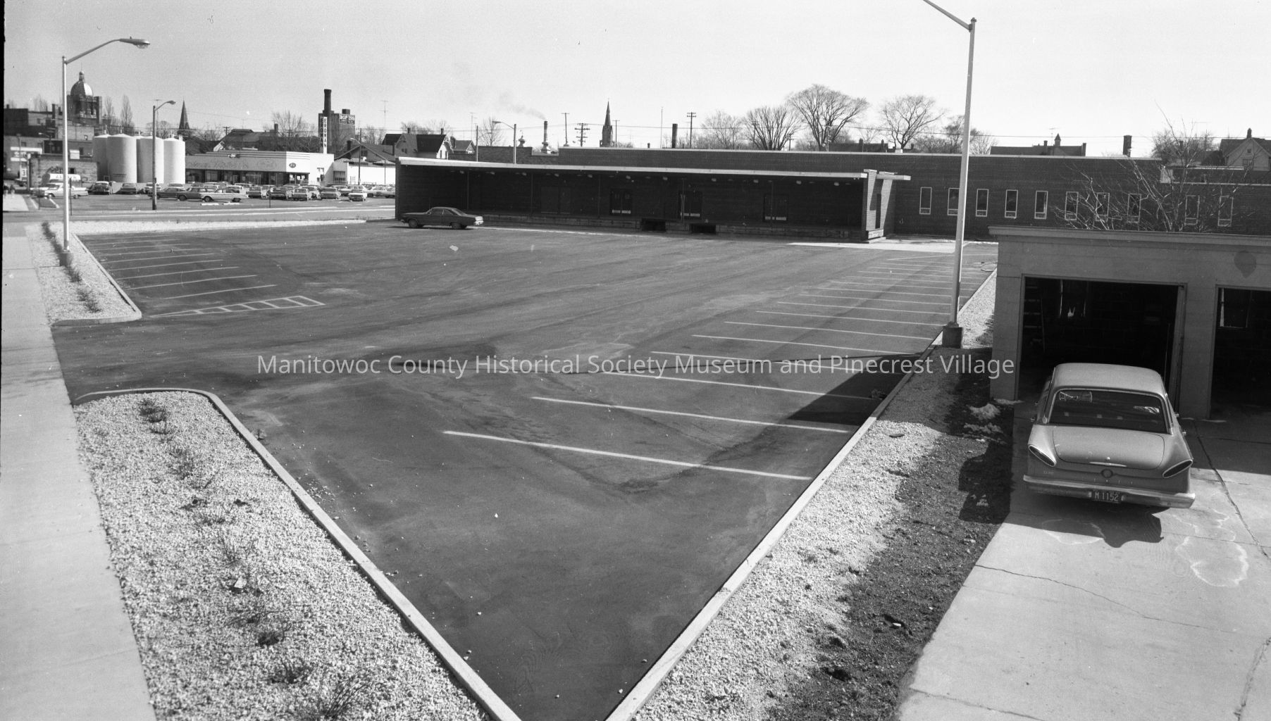 Manitowoc Post Office, 1202 Franklin Street Manitowoc; looking from South Water Street at parking lot & loading dock. At left is Erdman Ford dealership, 1101 Franklin Street and storage tanks for Triangle Oil Company, 1102 Franklin Street. Photograph taken in March 1965.Made/Created