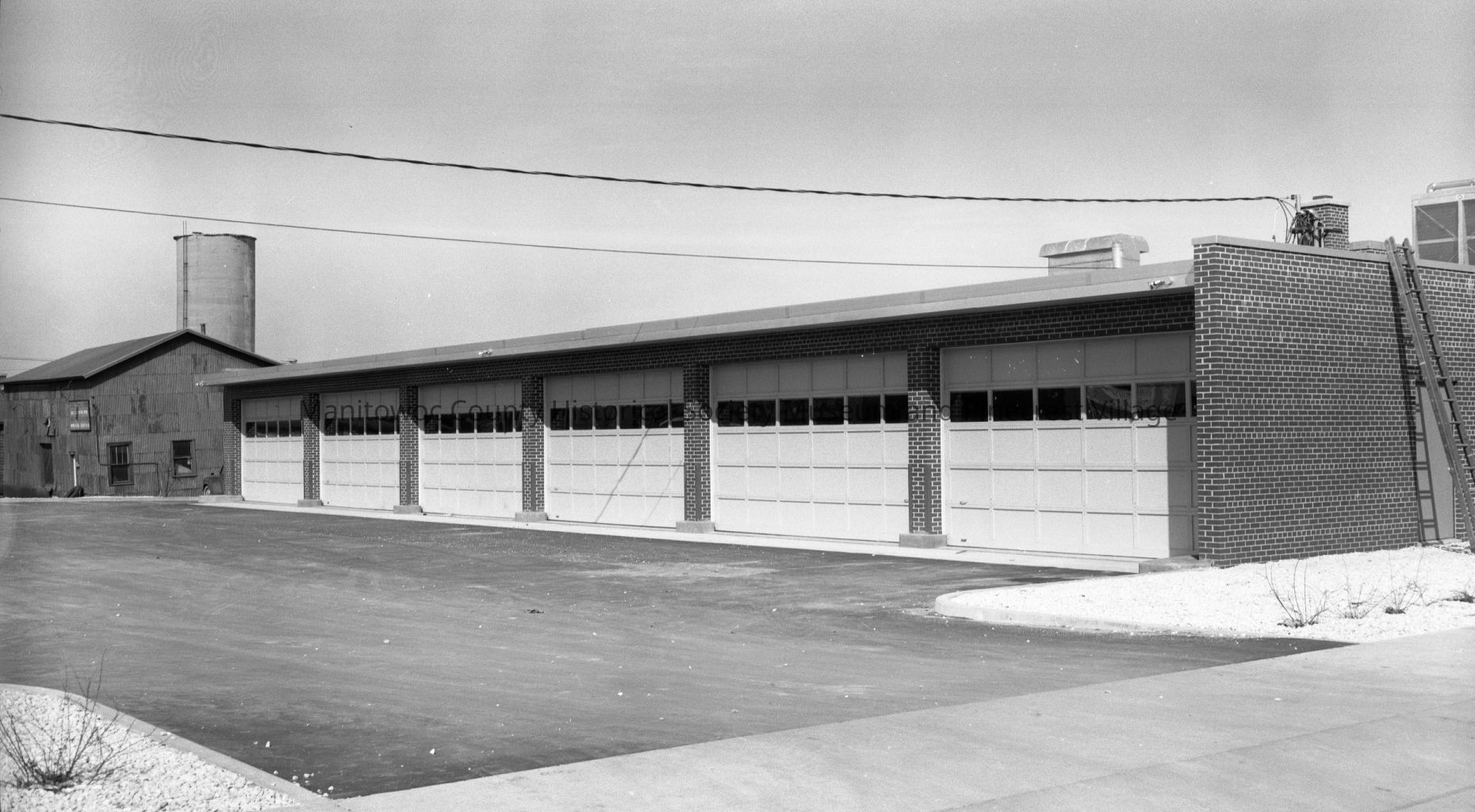 Manitowoc Post Office, 1202 Franklin Street Manitowoc; looking from Franklin Street at the vehicle garages on west side of new post office. Photograph taken in March 1965.Made/Created