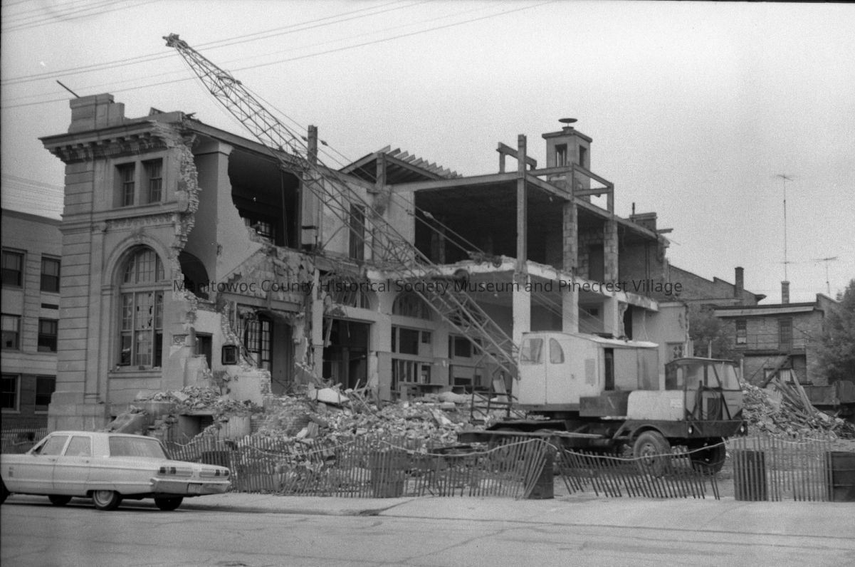 Manitowoc Post Office, 901 Franklin Street; coming down. Circa 1970.
