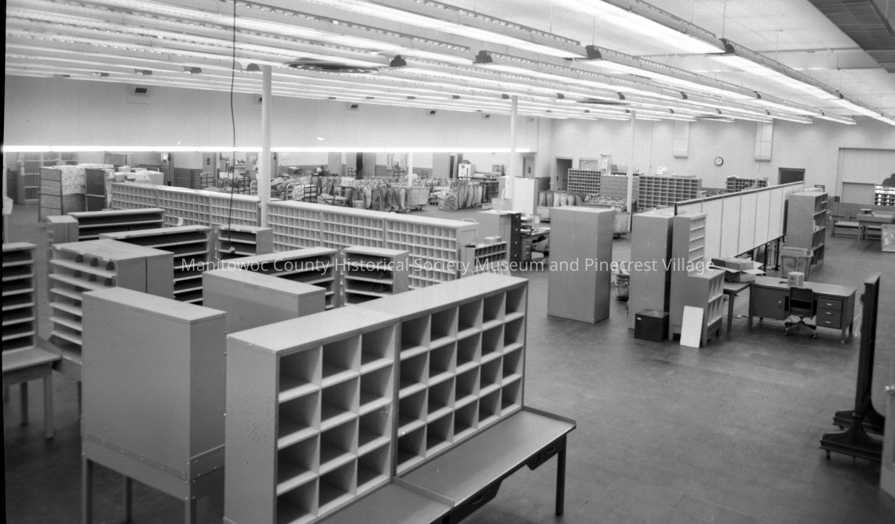 Manitowoc Post Office, 1202 Franklin Street Manitowoc; sorting room at new building. Photograph taken in March 1965.Made/Created