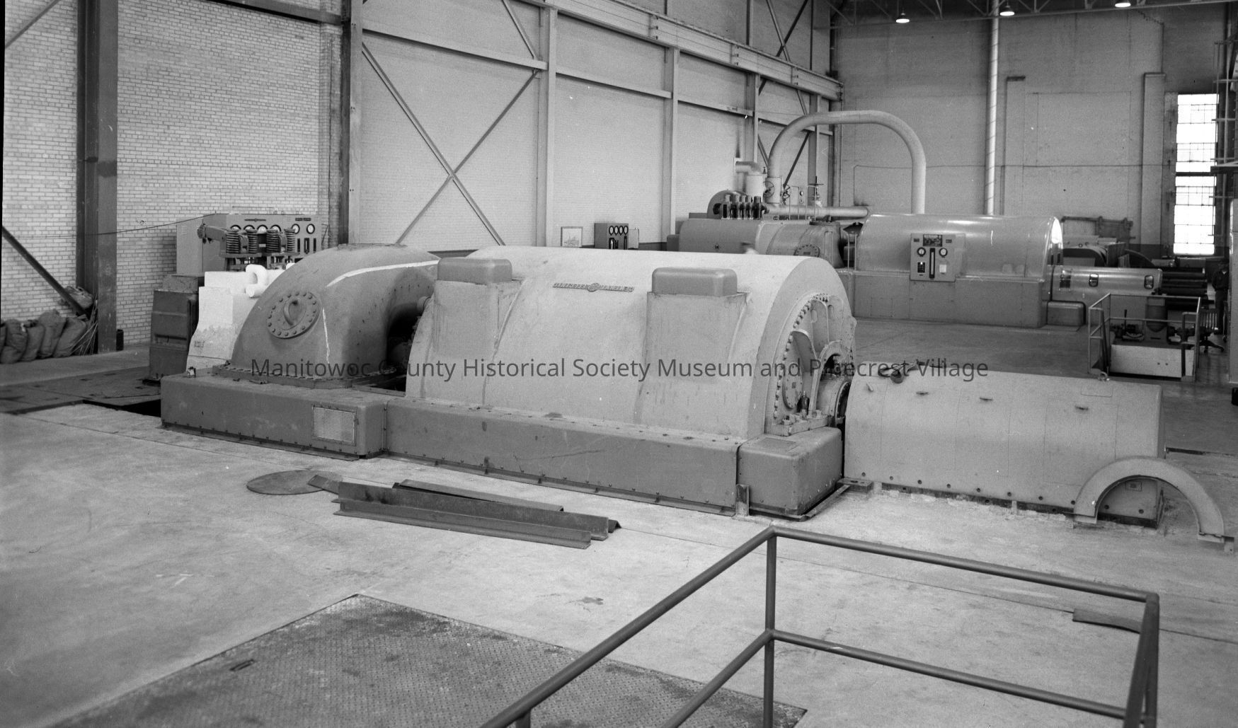 Manitowoc Public Utilities, 621 Columbus Street Manitowoc; power plant interior, #4 & #5 turbines. Photograph taken on January 11th, 1964.Made/Created