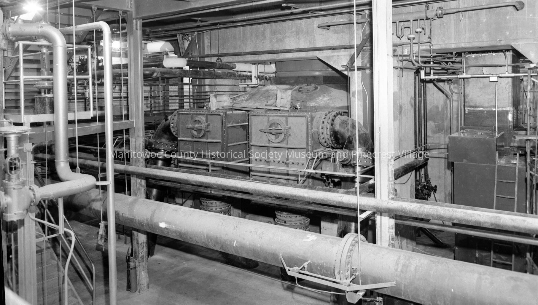 Manitowoc Public Utilities, 621 Columbus Street Manitowoc; power plant interior, condenser and pipes at #7 boiler. Photograph taken on January 11th, 1964.Made/Created