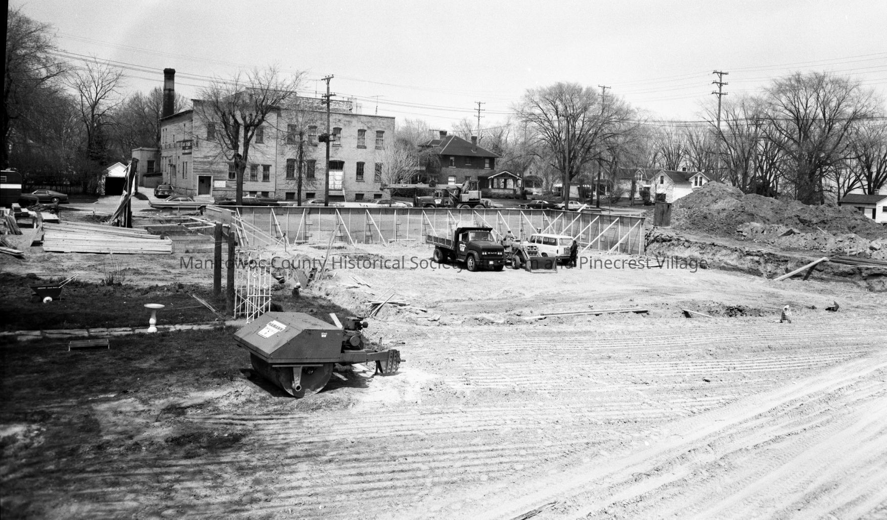 Manitowoc Public Utilities, 621 Columbus Street Manitowoc; ground prep for new building at 1300 block South 8th Street, looking north with large building in center is old A.W. Richter Vinegar plant, 710 Madison Street. Photograph taken on May 17th, 1969.Made/Created