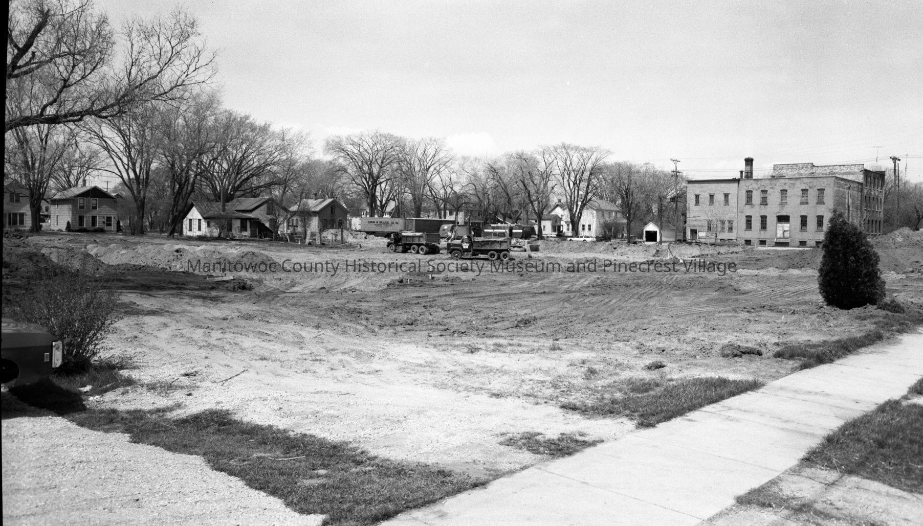 Manitowoc Public Utilities, 621 Columbus Street Manitowoc; ground prep for new building at 1300 block South 8th Street, looking northwest from South 7th Street. Building at right is old A.M. Richter Vinegar plant, 710 Madison Street. Photograph taken on May 13th, 1968.Made/Created