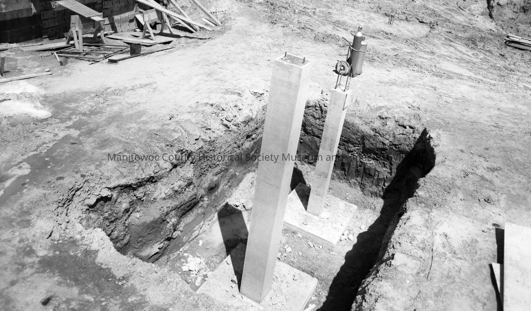 Manitowoc Public Utilities, 621 Columbus Street Manitowoc; ground prep for new building at 1300 block South 8th Street, footing & beem. Photograph taken on June 8th, 1969.Made/Created