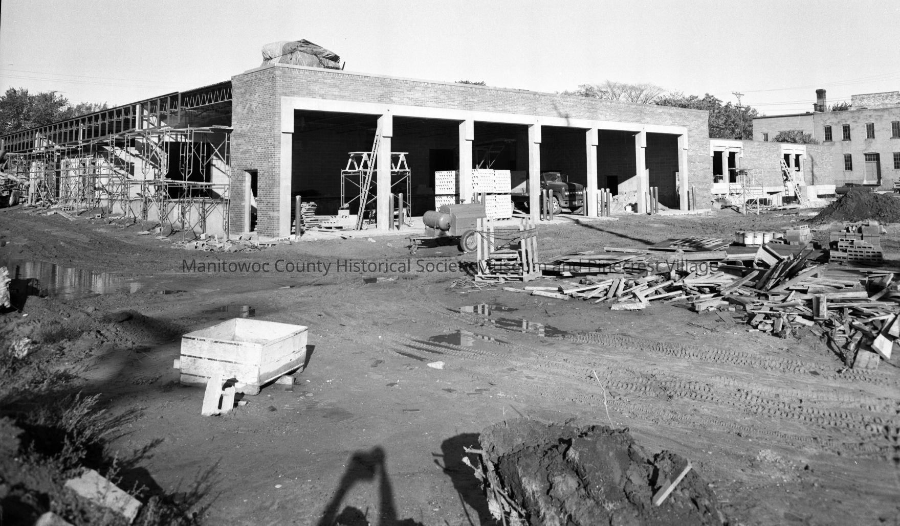 Manitowoc Public Utilities, 621 Columbus Street Manitowoc; progress on new building at 1300 block South 8th Street, looking at back with old A.M. Richter vinegar plant, 710 Madison Street at right. Photograph taken on October 14th, 1969.Made/Created
