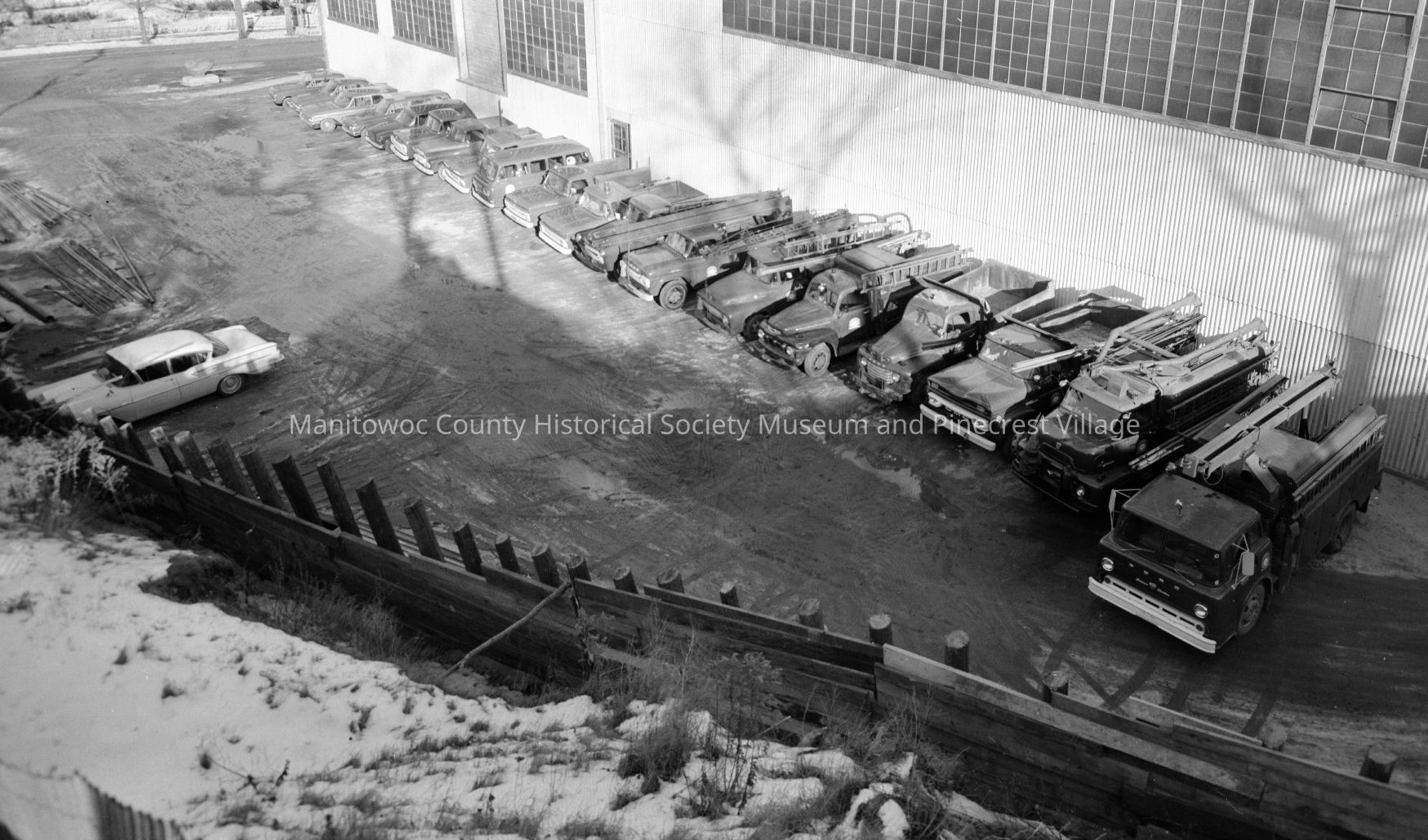 Manitowoc Public Utilities, 621 Columbus Street Manitowoc; fleet of cars & trucks. Photograph taken on January 3rd, 1964.Made/Created