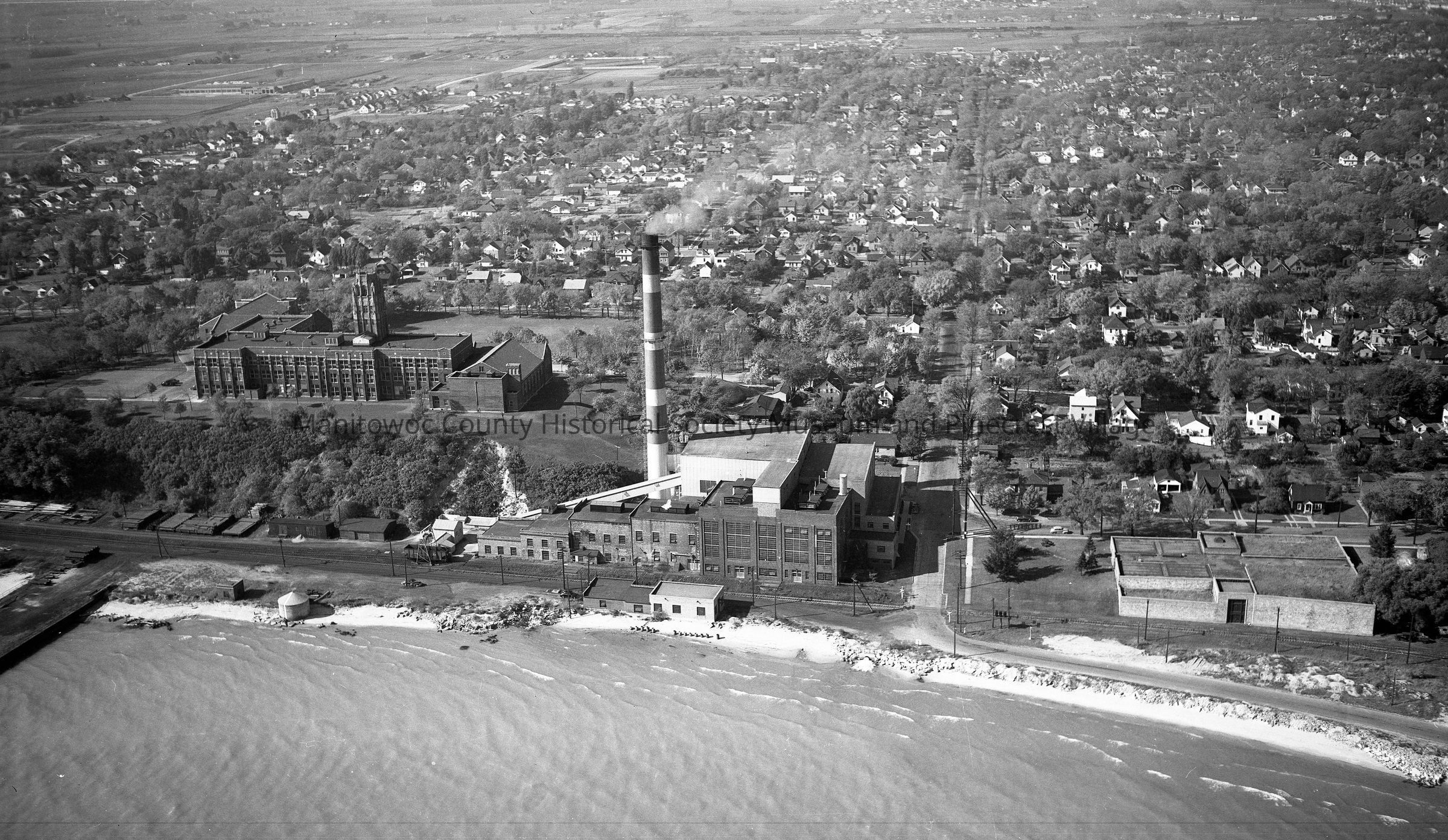 Aerial view of Manitowoc Public Utilities, 621 Columbus Street. Behind is Lincoln High School, 1433 South 8th Street. Photograph taken in October 1953.Made/Created