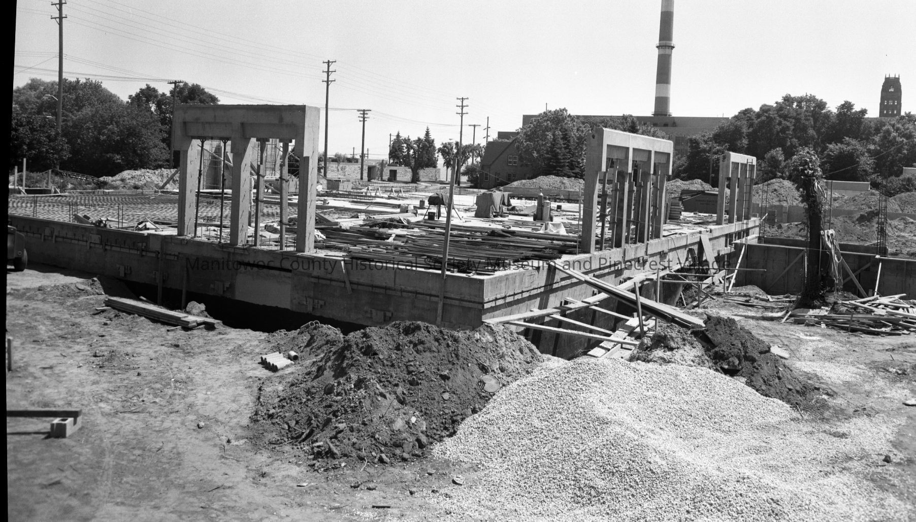 Manitowoc Public Utilities, 621 Columbus Street Manitowoc; ground prep for new building at 1300 block South 8th Street, looking southeast with power plant & smoke stack in center and at left Lincoln High school tower. Photograph taken on July 13th, 1969.Made/Created