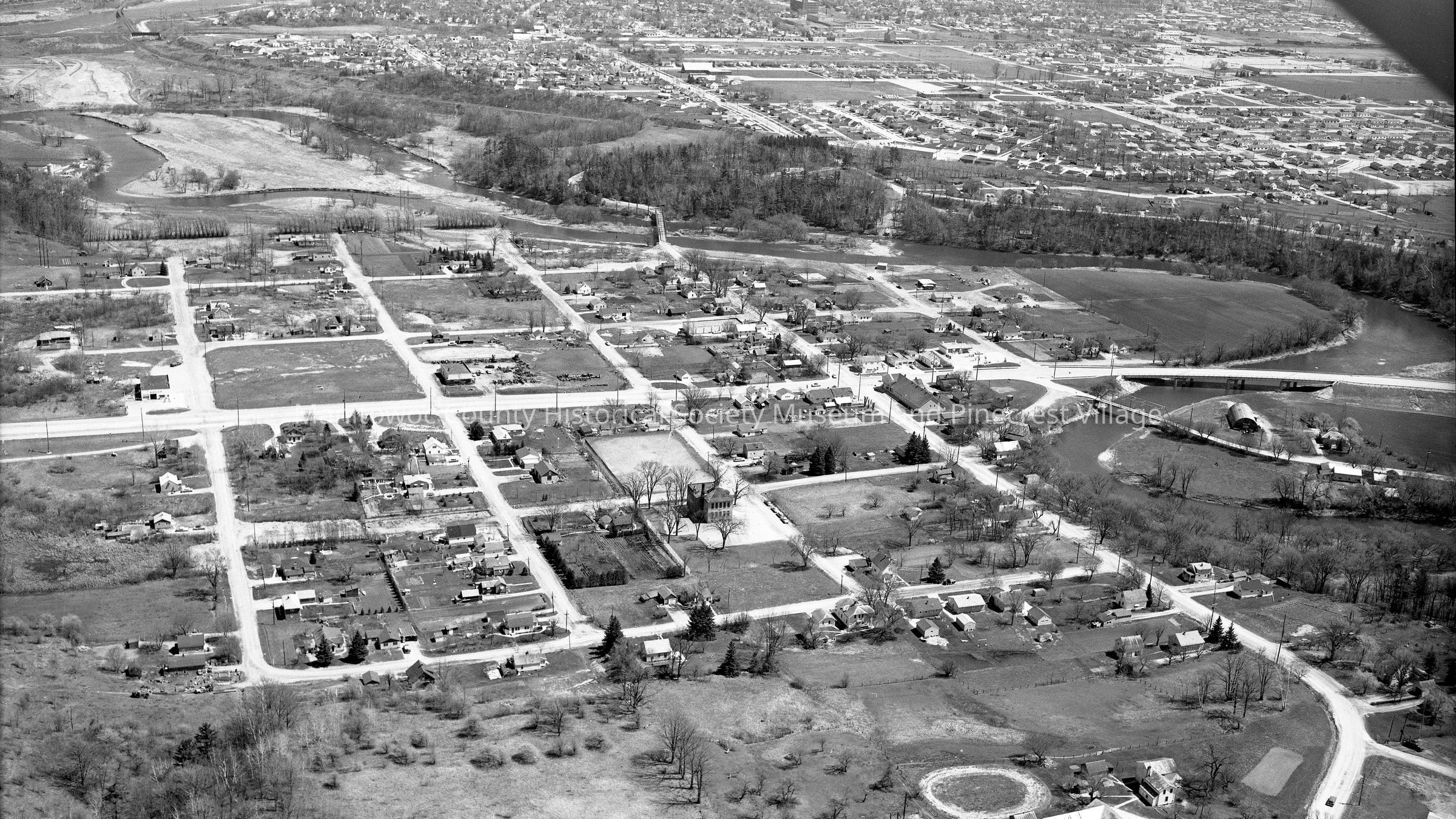 Aerial view of Manitowoc Rapids looking east. At lower right corner is Broadway Street and road running right to left in center is Hwy 141 or Rapids Road. Photograph taken in August 1963.Made/Created