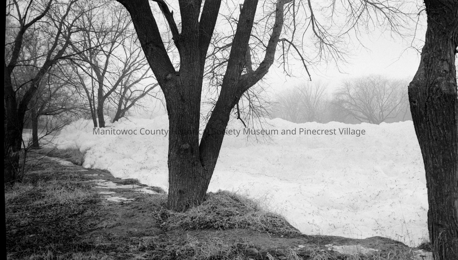 Manitowoc Rapids; foam in river below the dam. Photograph taken on March 12th, 1953.