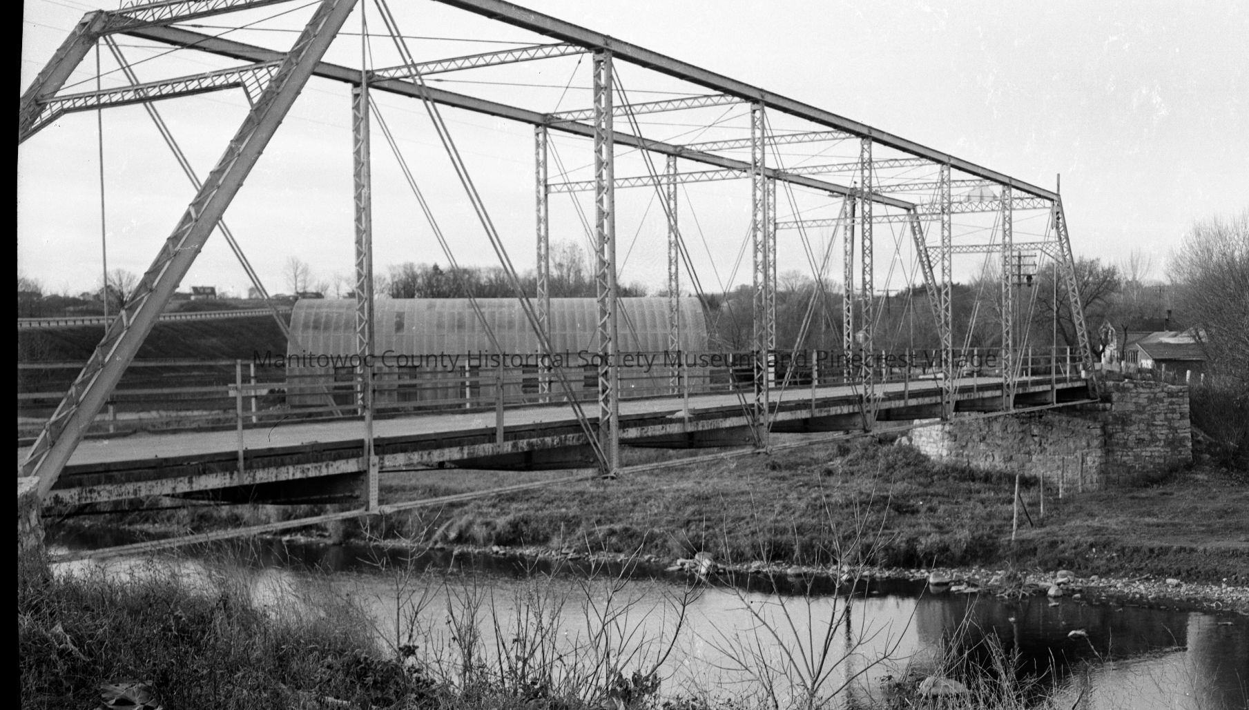 Manitowoc Rapids; old road bridge, at left is new road and center is Manitowoc Tractor Sales shop on Mill Road. Photograph taken in November 1956.Made/Created