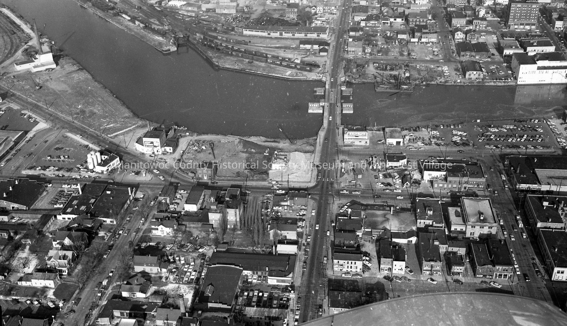 Aerial of the intersection South 10th and Franklin Street. Northwest corner is groundwork for new Manitowoc Savings Bank; across street is the Spindler Company, 821 South 10th and the Spindler Phillips 66 gas station, 827 South 10th. At left edge of plane's wing is Bouril Dodge dealership, 916 South 10th. At left in photo is intersection of South 11th, South Water and Franklin streets. The fuel tanks are Triangle Oil & Gas, 1102 Franklin and across street on South 11th is Erdman Ford dealership, 1101 Franklin. Photograph taken on December 3rd, 1966.Made/Created