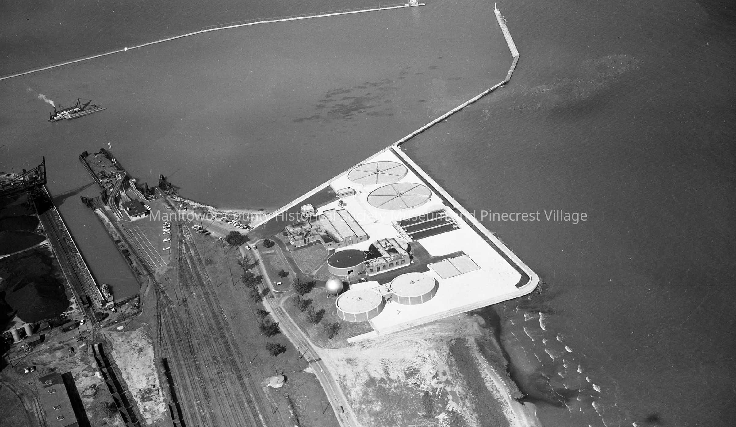 Aerial: Manitowoc Sewage Disposal Plant at the lakefront on the railroad marshalling yards for the carferries. Looking north there is Corps of Engineers dredge deepening the turning basin,