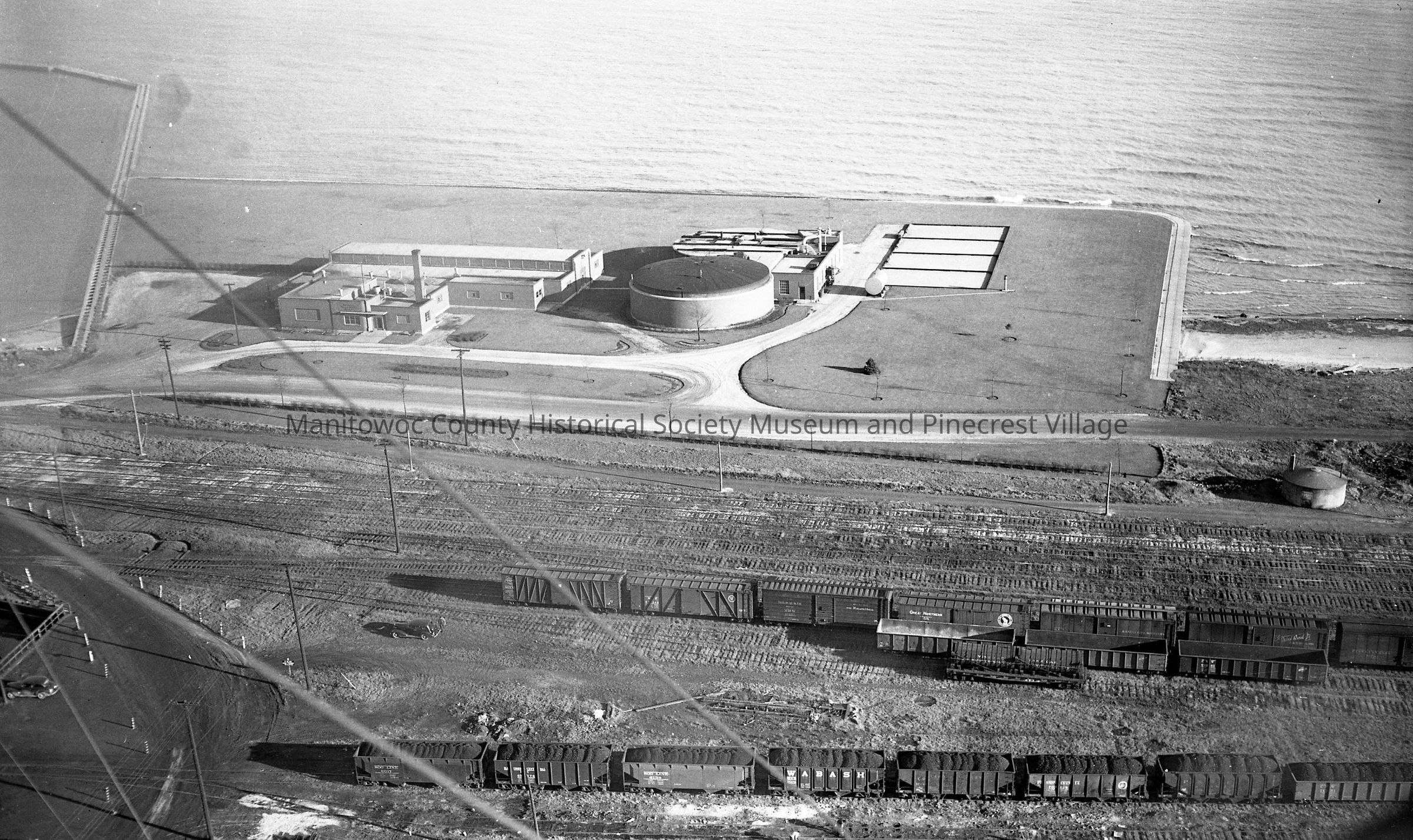 Aerial of Manitowoc Sewage Treatment plant on the south lakefront. Photograph taken on December 10th, 1946.Made/Created