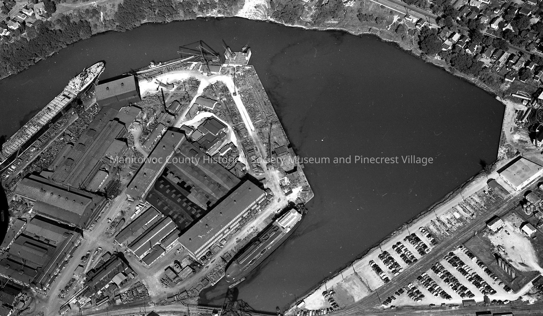 Aerial view of Manitowoc Shipbuilding at bottom. At bridge is carferry Chief Wawatam and submarine is 199 Tautag. Starting to be built at wateredge center is Detroit Edison. Photograph taken in November 1953.Made/Created